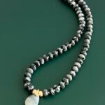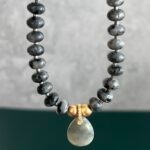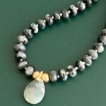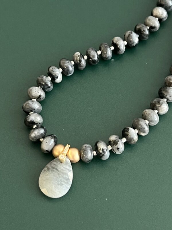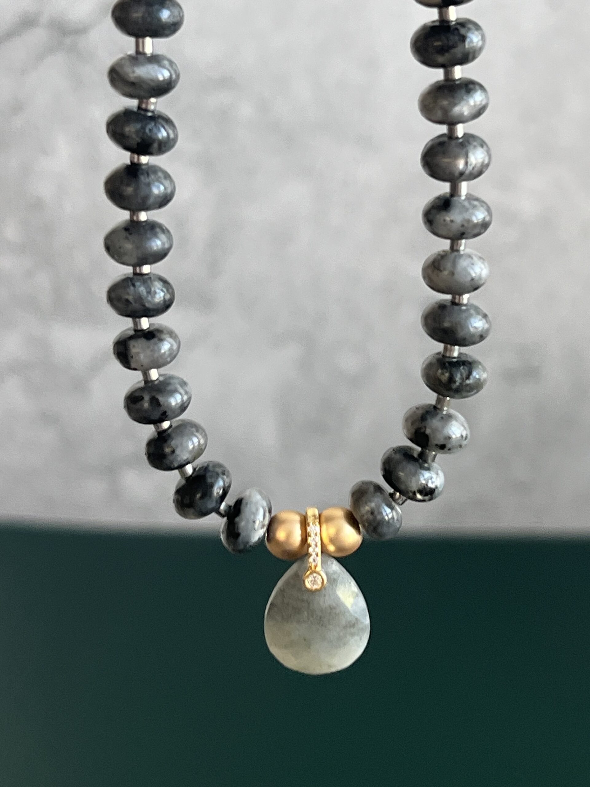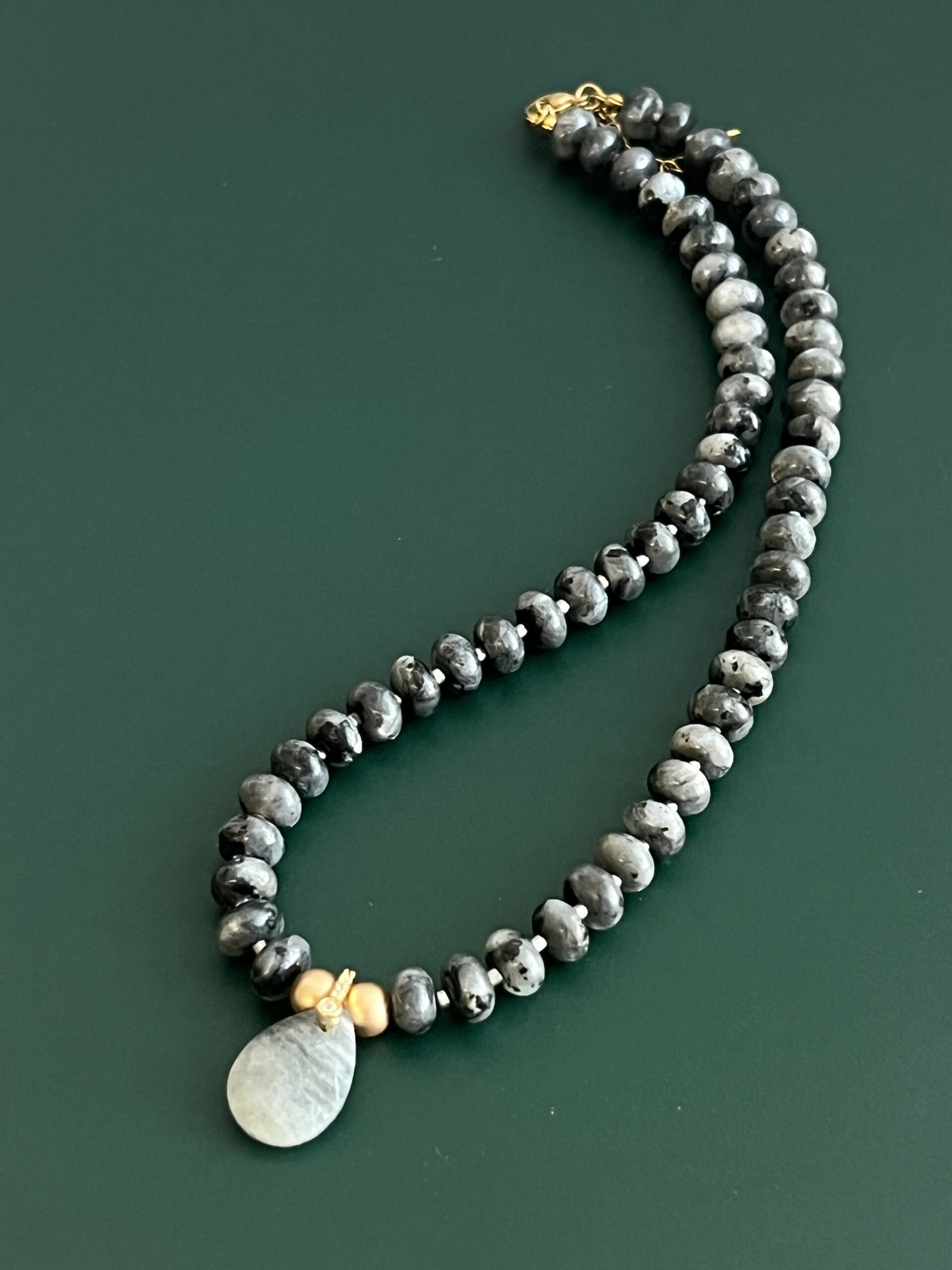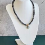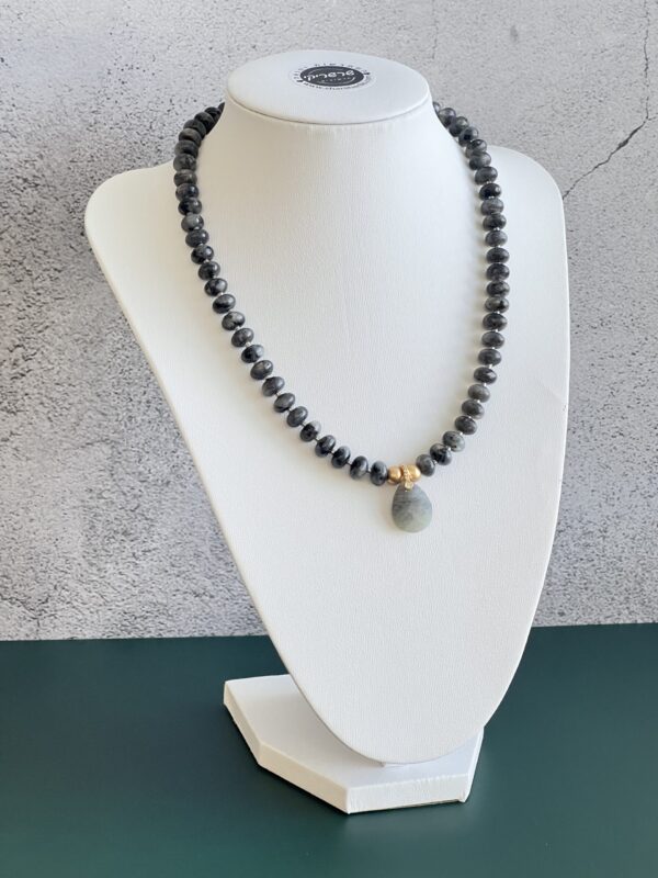 שרשרת גוונים עשויה חרוזי לברדורייט שחורים, ותליון לברדורייט בצורת טיפה בגוון ירוק כהה.