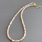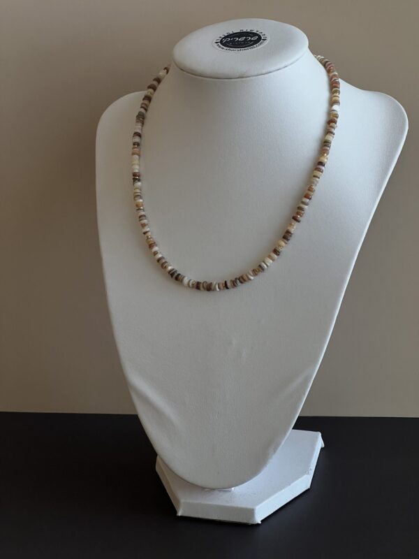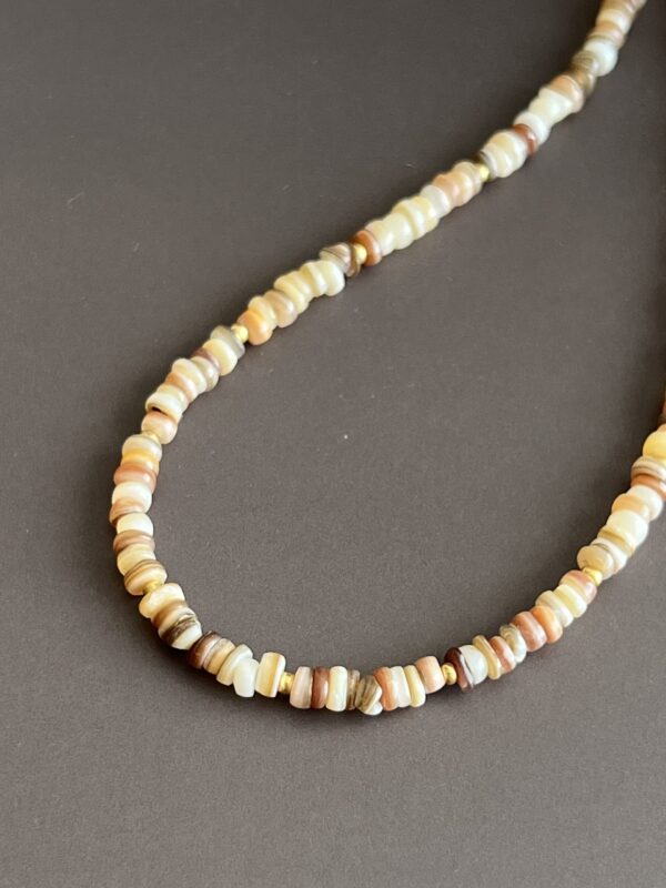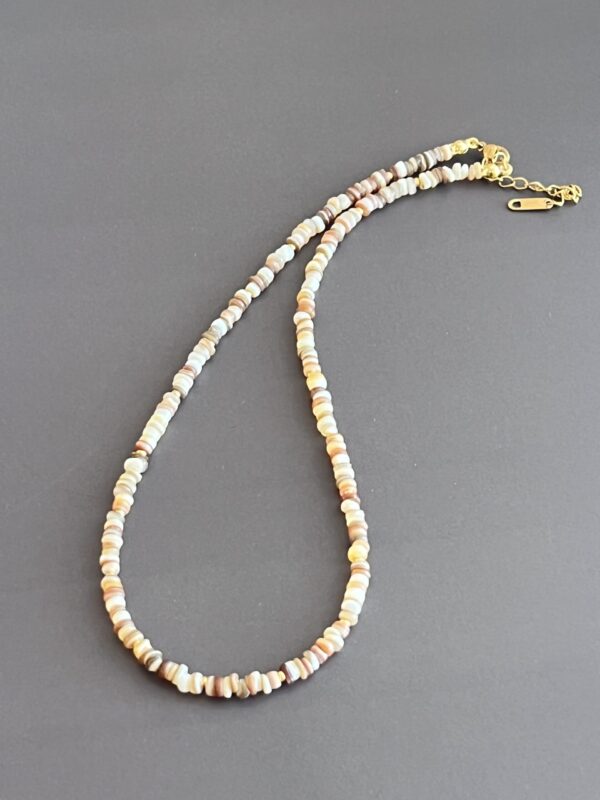 השרשרת עשויה חרוזי צדף שטוחים בטקסטורה טבעית ומגוונת בגוני בז’, חום וזהב.