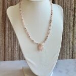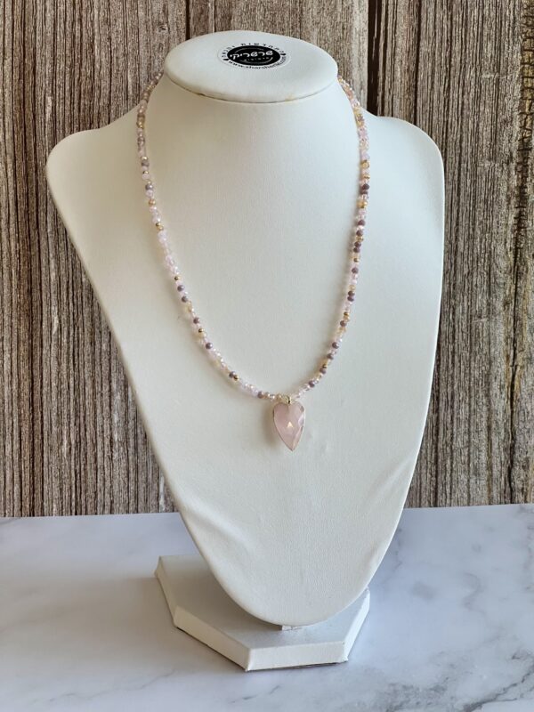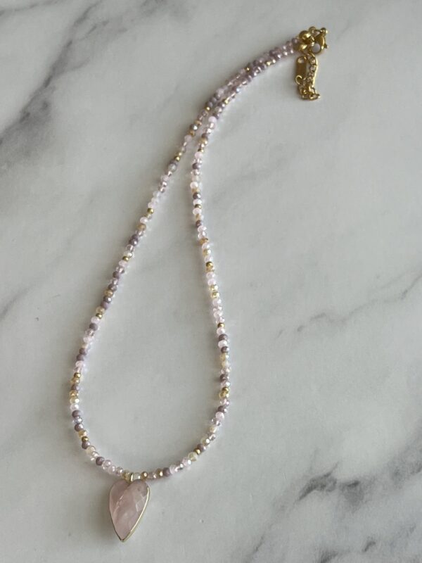 רכות נשית, אופטימיות וצבע שמעלה את מצב הרוח. שילוב בין חרוזים בגווני ורוד עתיק עם נגיעות של זהב, ותליון לב רוז קוורץ יוצרים מראה חם, ייחודי ומחבק.