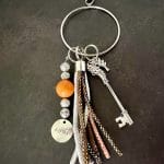 קישוט עם תליון מפתח מתכתי סוסון ים ותליון השראה Karma ותליון חרוזים כסוף וכתום.