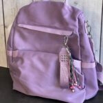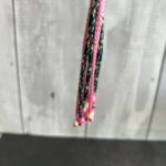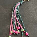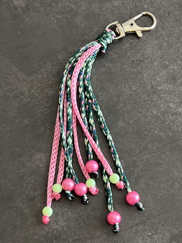 קישוט לתיק או כמחזיק מפתחות עשוי חבלים בירוק וורוד עם חרוזים תלויים .