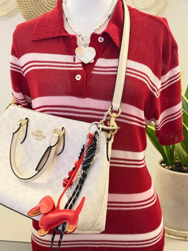 קישוט צ’ארם גדול ועשיר בשילוב כלבלב עשוי דמוי עור באדום, חבל שחור מלופף, שורת חרוזים עם לב זכוכית אדום ושרשרת לולאות כסופה, זה הצ’ראם שישדרג לך את התיק, הג’ינס ואת מצב הרוח.