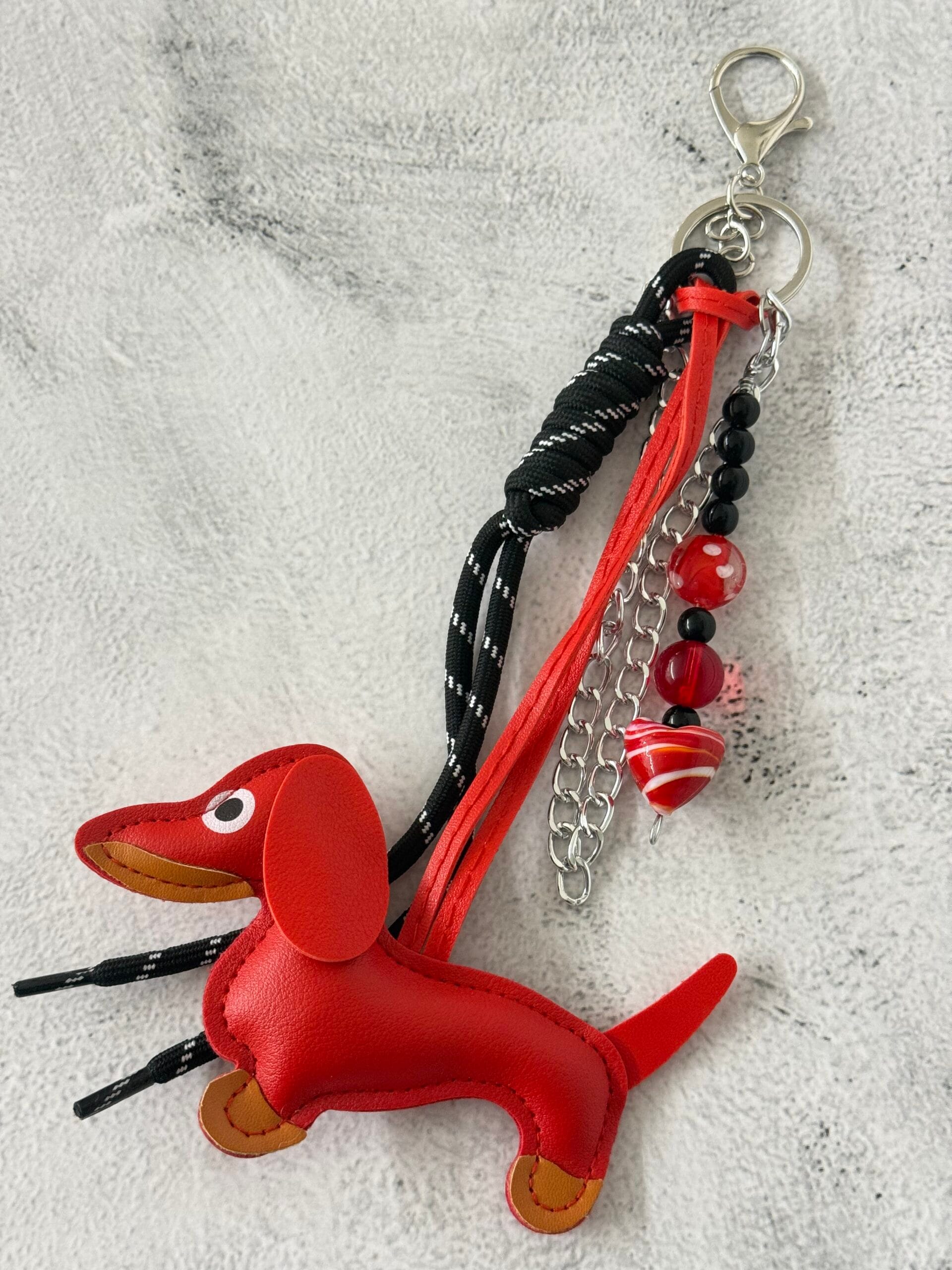קישוט צ’ארם גדול ועשיר בשילוב כלבלב עשוי דמוי עור באדום, חבל שחור מלופף, שורת חרוזים עם לב זכוכית אדום ושרשרת לולאות כסופה, זה הצ’ראם שישדרג לך את התיק, הג’ינס ואת מצב הרוח.