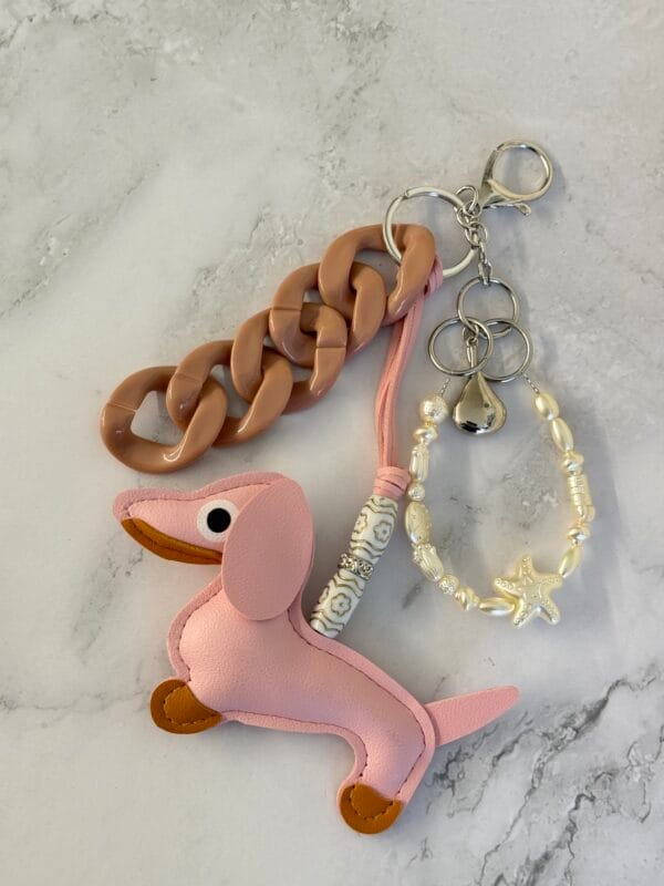 קישוט צ’ארם גדול ועשיר בשילוב כלבלב עשוי דמוי עור בורוד, שורת חרוזים דמוי פנינים עם תליון טיפה כסופה ושרשרת לולאות אקריל ורודות, זה הצ’ראם שישדרג לך את התיק, הג’ינס ואת מצב הרוח.