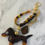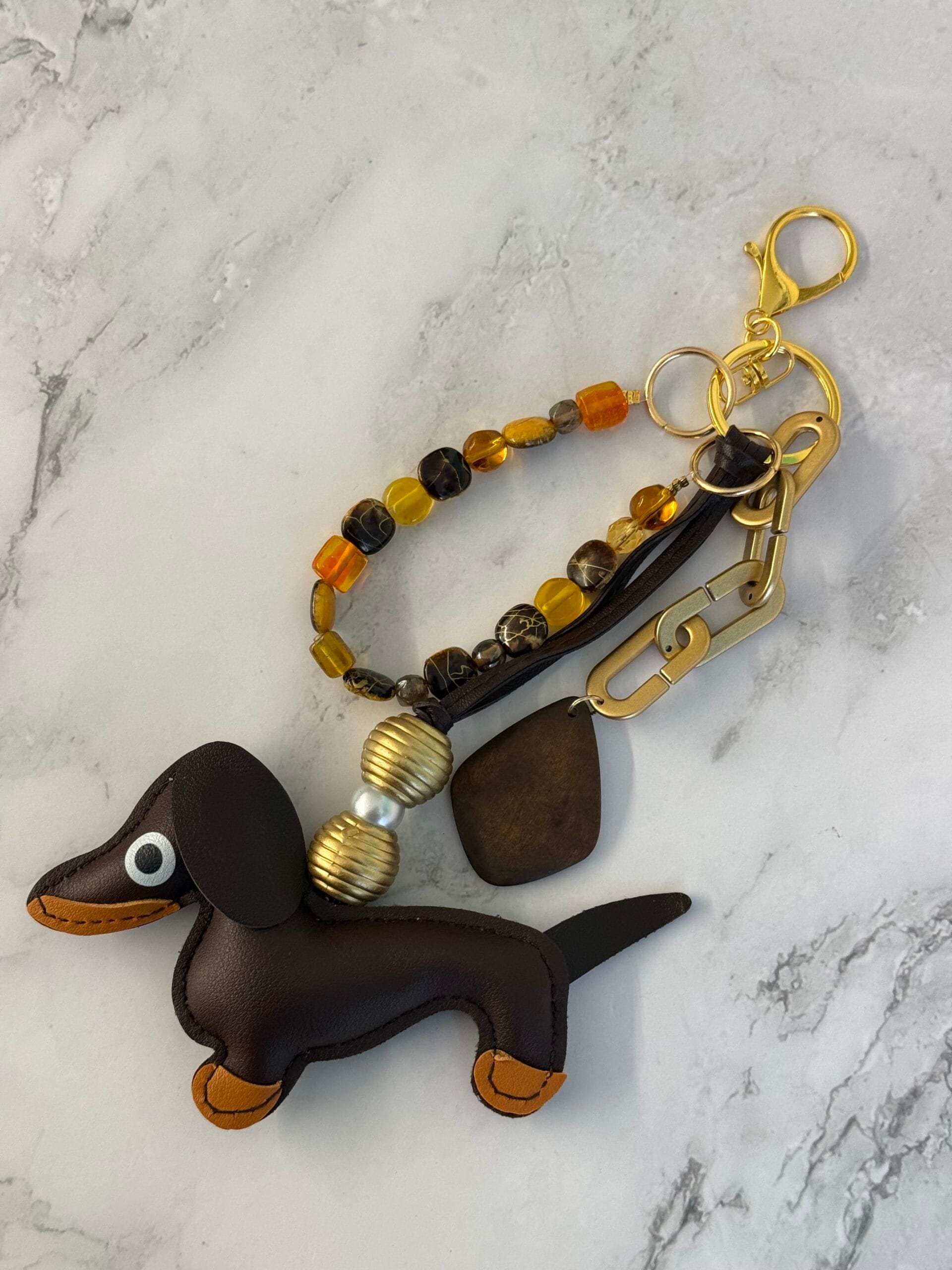 קישוט צ’ארם גדול ועשיר בשילוב כלבלב עשוי דמוי עור חום, שורת חרוזי זכוכית ואקריל בצהוב וחום ושרשרת לולאות אקריל בזהב מט, עם תליון מעוין עשוי עץ. זה הצ’ראם שישדרג לך את התיק, הג’ינס ואת מצב הרוח.
