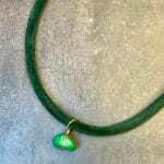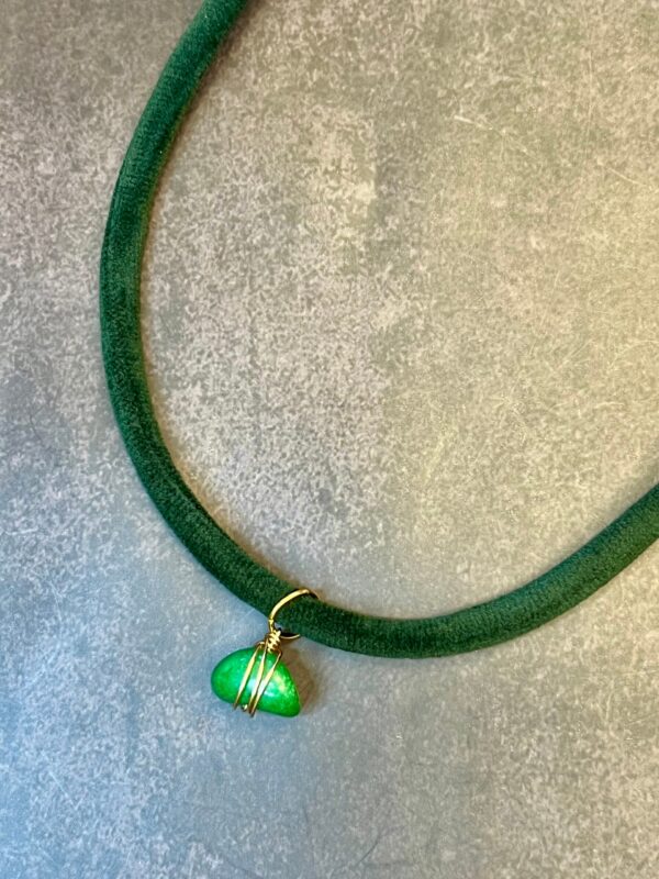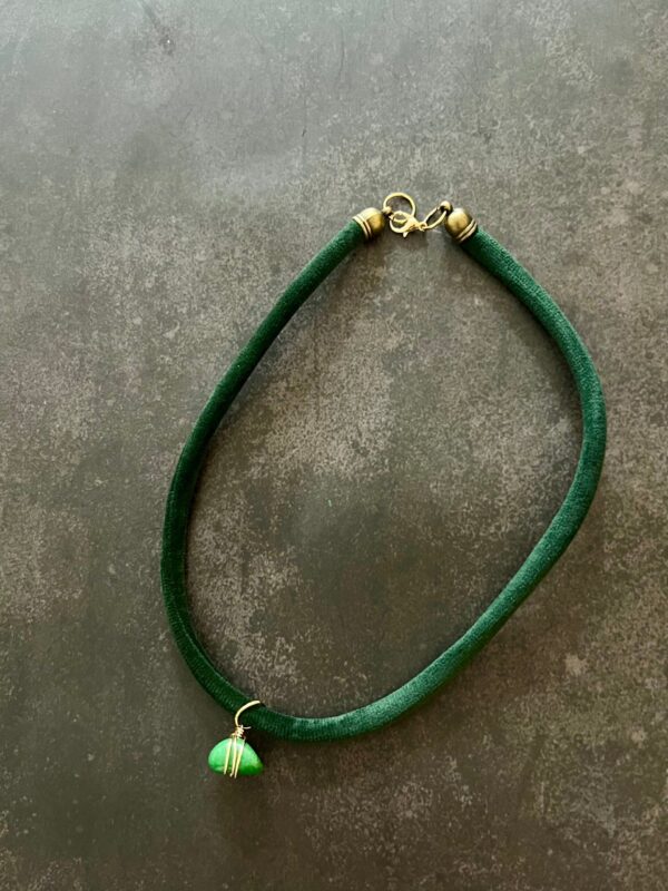 שרשרת עשויה חבל קטיפה בגוון ירוק כהה עם תליון אבן חן ירוקה .