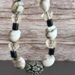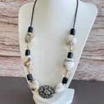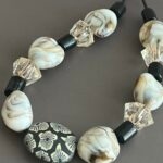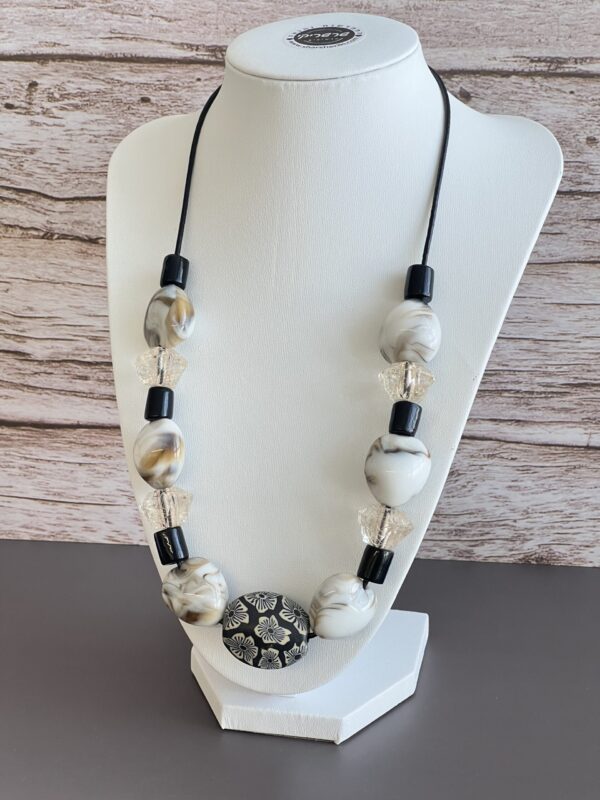 שרשרת עשויה חוט עור ועליו מושחלים חרוזי זכוכית ואקריל בגווני חום בהיר ושחור.