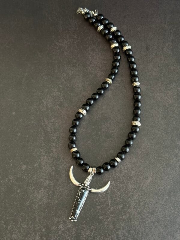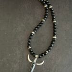 שרשרת יוניסקס חרוזי אוניקס שחורות עם תליון שור כסוף משובץ אבן תלוי על אלמנט עם זירקונים .