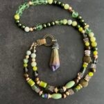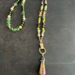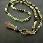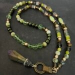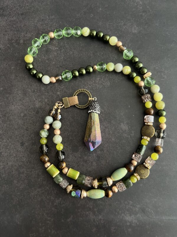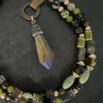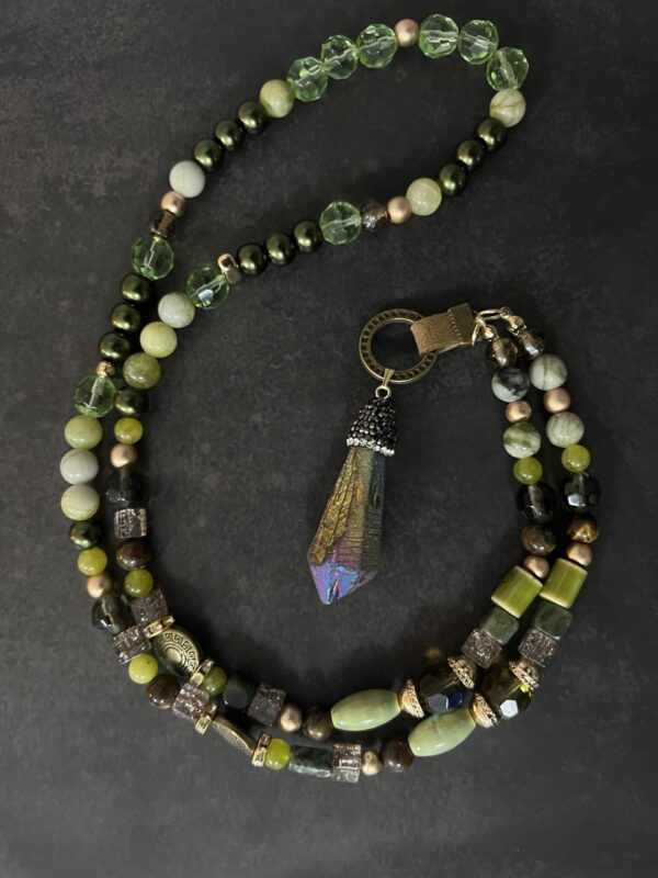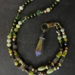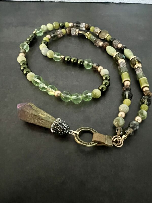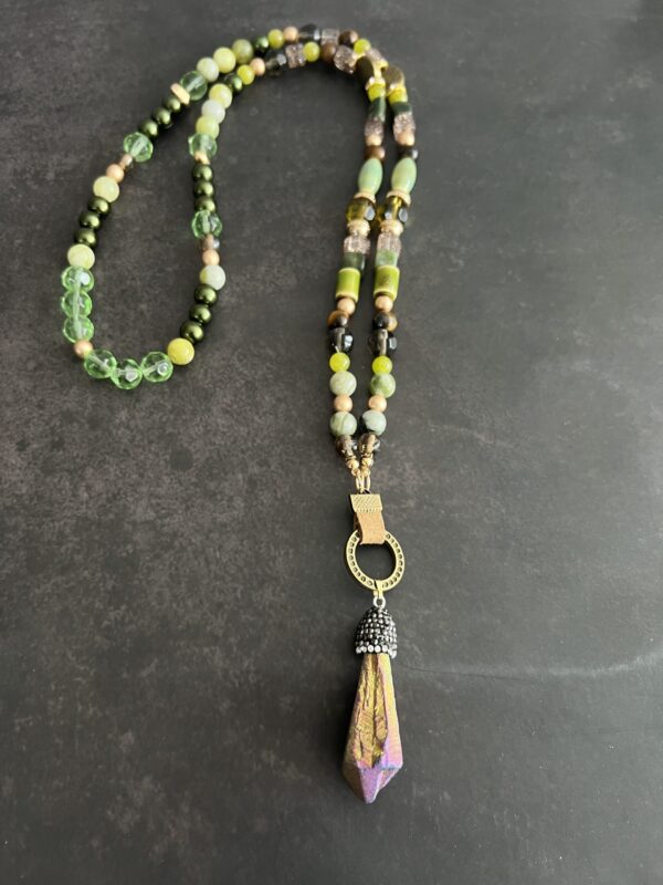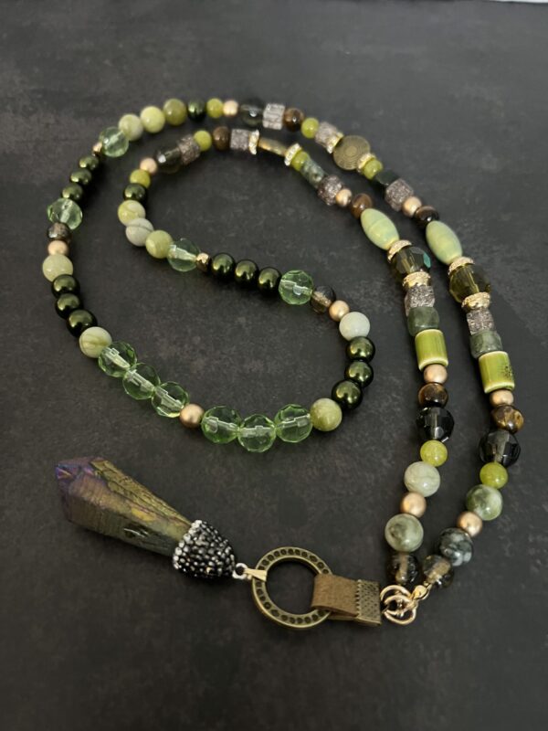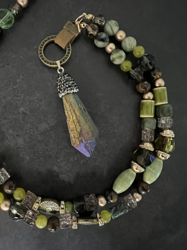 שרשרת אבני חן בגווני ירוק וחום, זהב וברונזה, עם מגוון אבני חן קריסטלים, זכוכית, מתכת, ארוכה ונוכחת עם תליון שמורכב מרצועת עור לולאת מתכת ותליון קריסטל בגווני ירוק חום, תלוי על כיפה משובצת אבני ריינסטון.