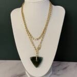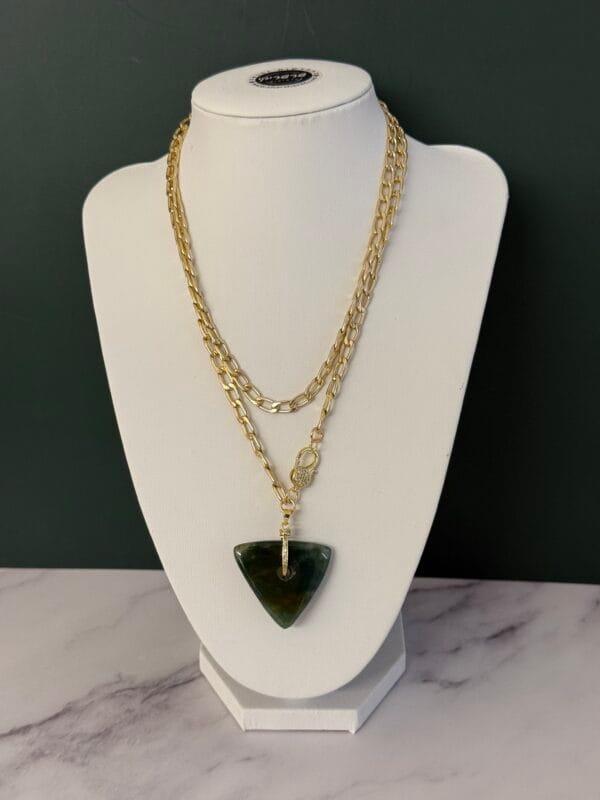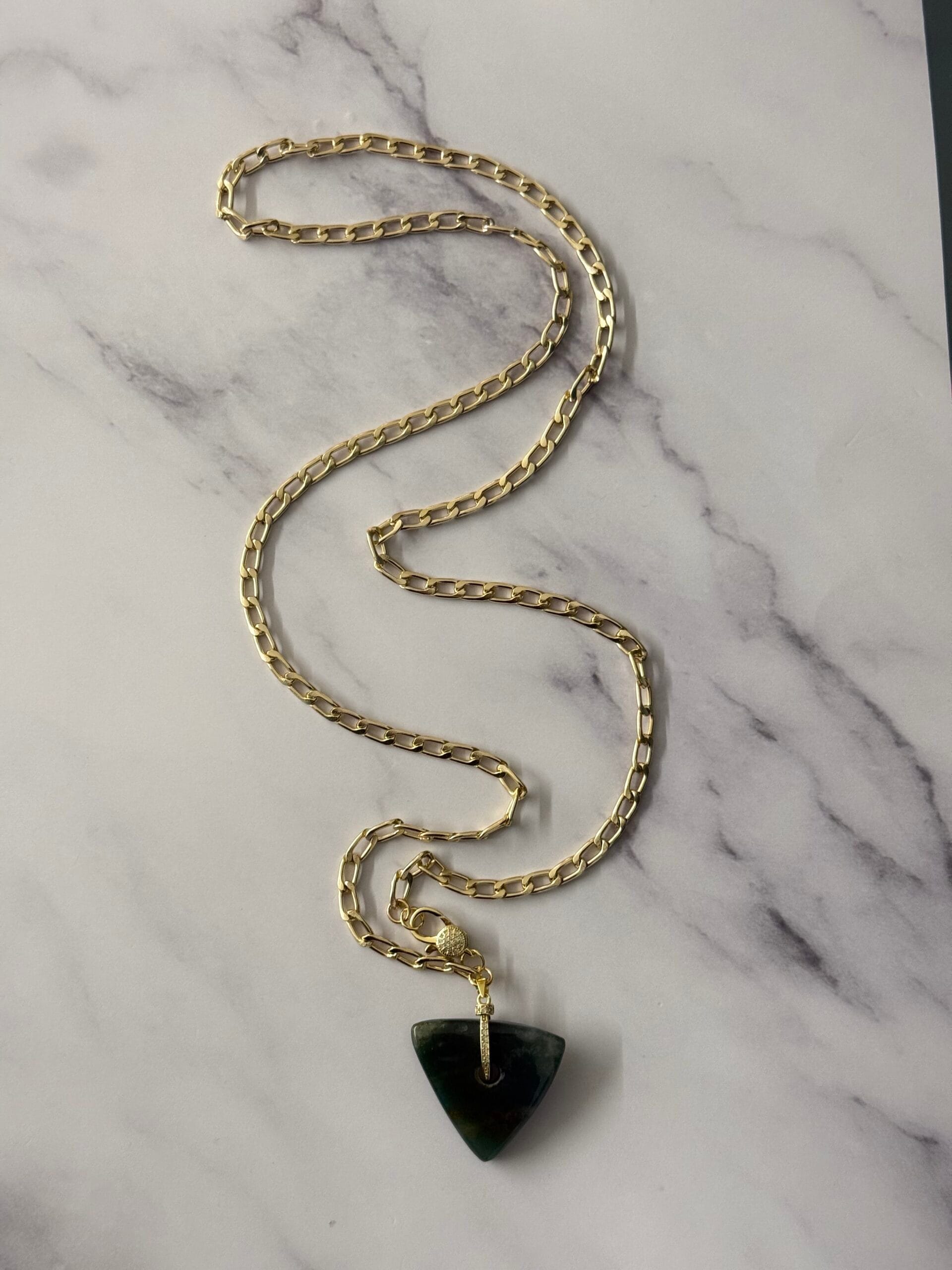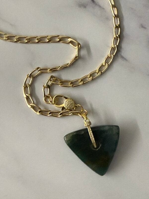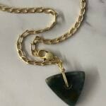 שרשרת לולאות אלומניום קלה ועמידה מוזהבת, עם משולש ירוק עשוי אבן חן ג׳ספר הידועה בתכונות איזון ויציבות, חיזוק פנימי, הרמוניה בין ניגודים, שקט וביטחון עצמי, אנרגיה מגנה ועדינה.