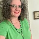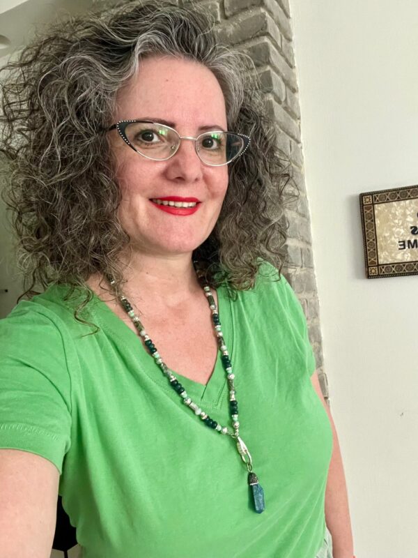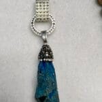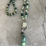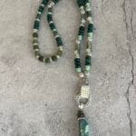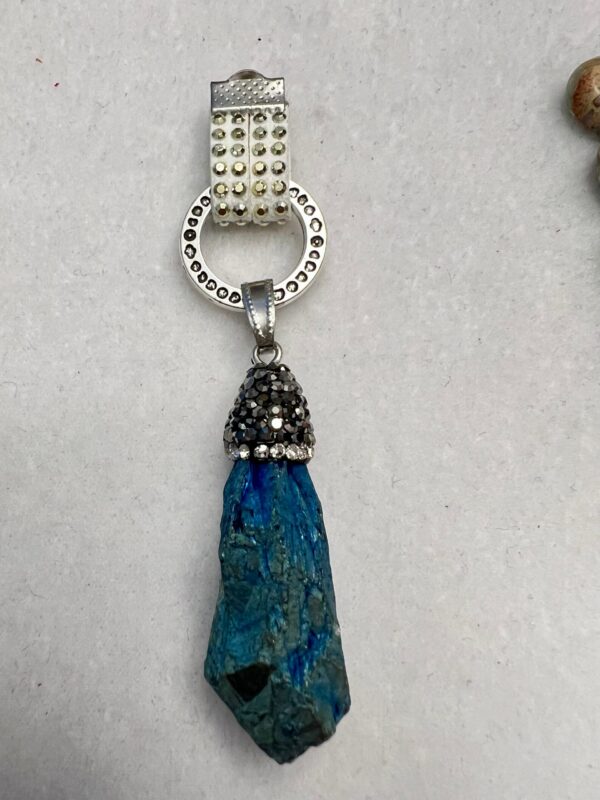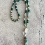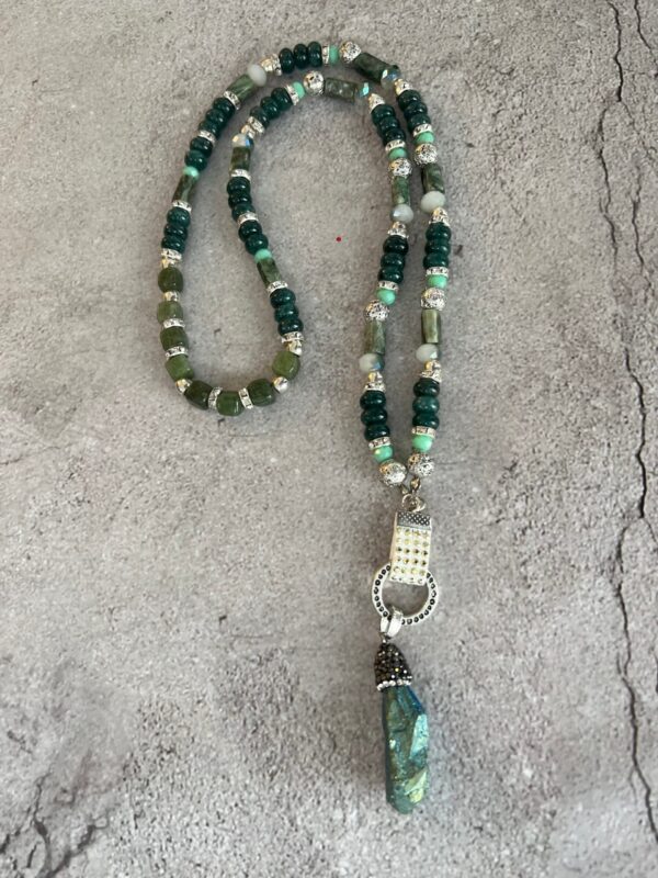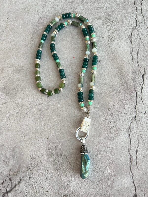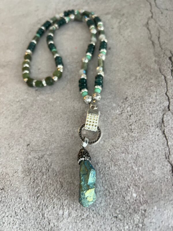 שרשרת אבני חן בגווני ירוק, כסף, טורקיז, עם מגוון אבני חן קריסטלים, זכוכית, מתכת, ארוכה ונוכחת עם תליון שמורכב מרצועת עור לולאת מתכת ותליון קריסטל בגווני כחול וירוק תלוי על כיפה משובצת אבני ריינסטון.