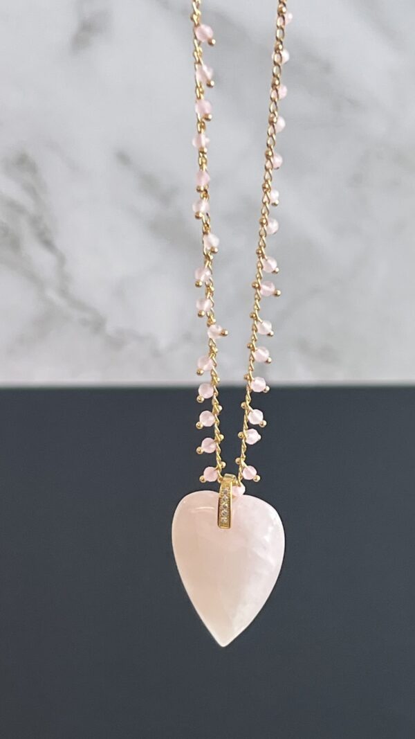 ֿהשרשרת עדינה שזורה באבני חן קטנות לאורך השרשרת המוזהבת עם תליון לב עשוי אבן חן טבעית.