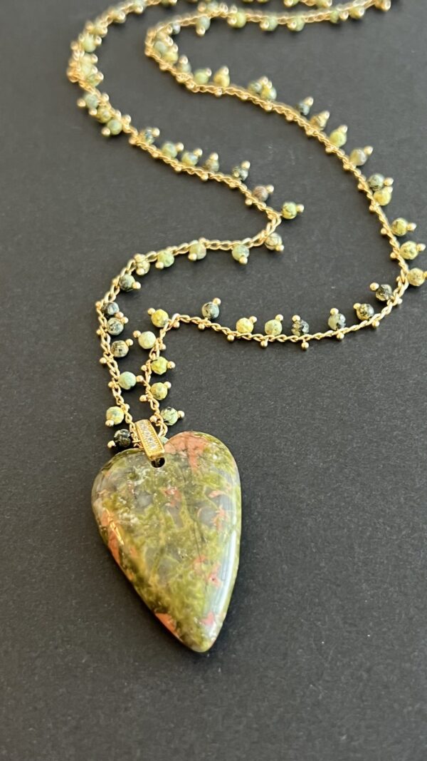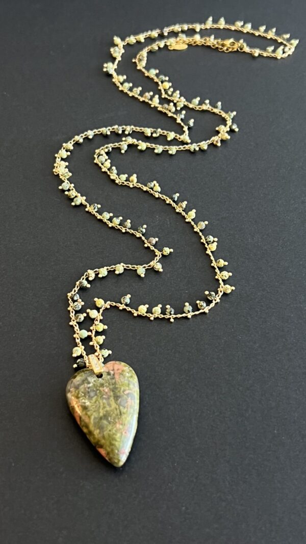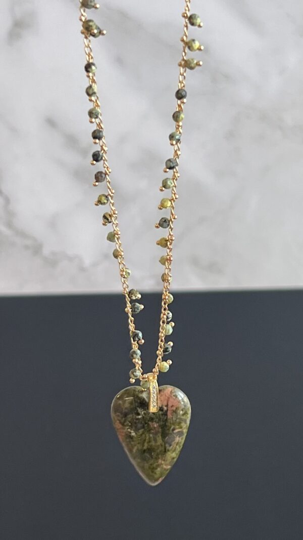 ֿהשרשרת עדינה שזורה באבני חן קטנות לאורך השרשרת המוזהבת עם תליון לב עשוי אבן חן טבעית.