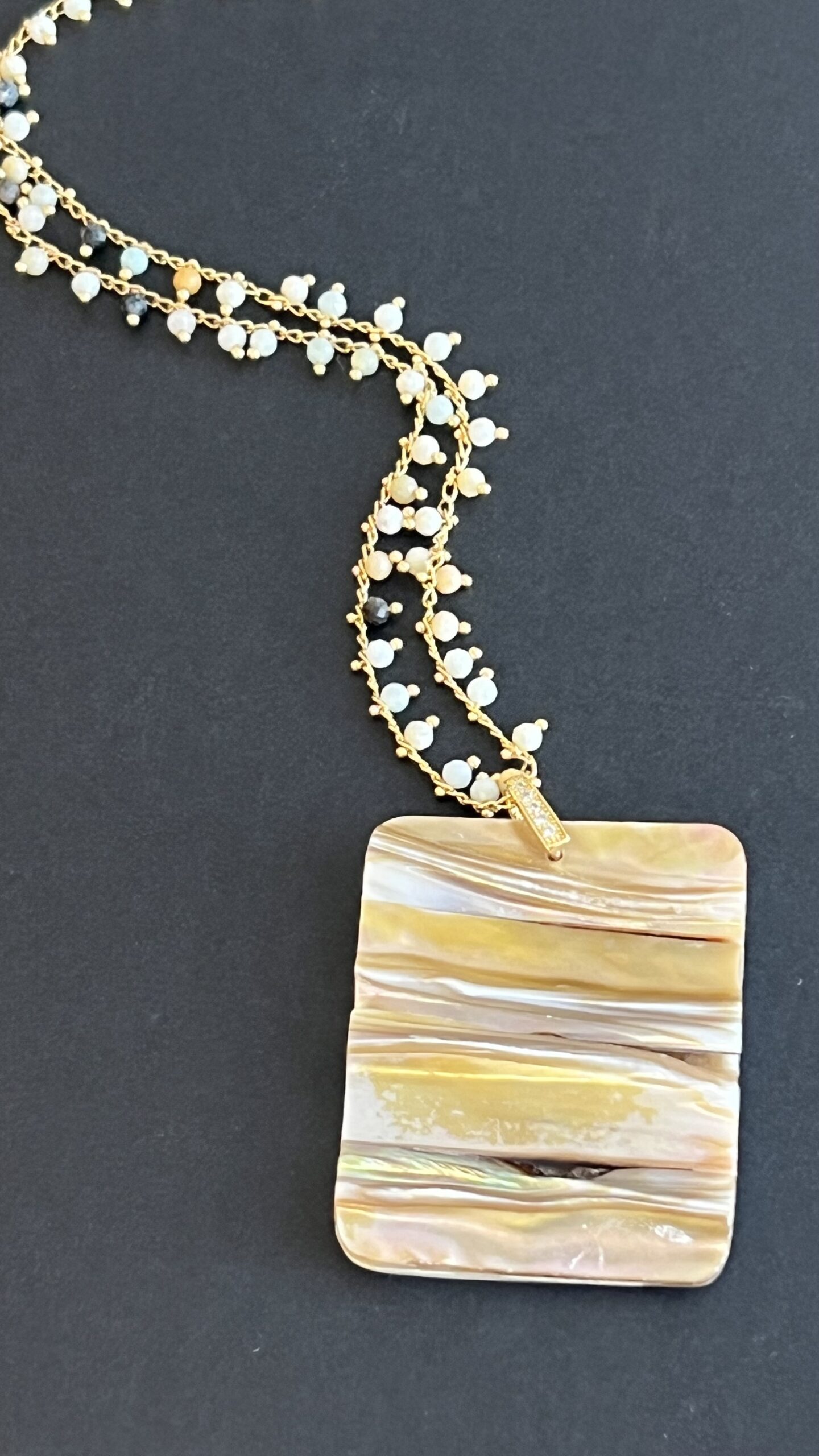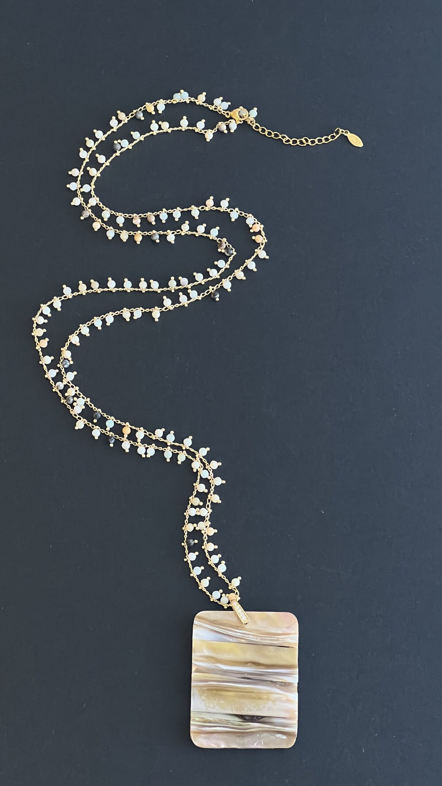 ֿהשרשרת עדינה שזורה באבני חן קטנות לאורך השרשרת המוזהבת עם תליון גדול עשוי צדף.
