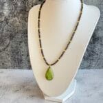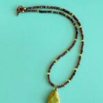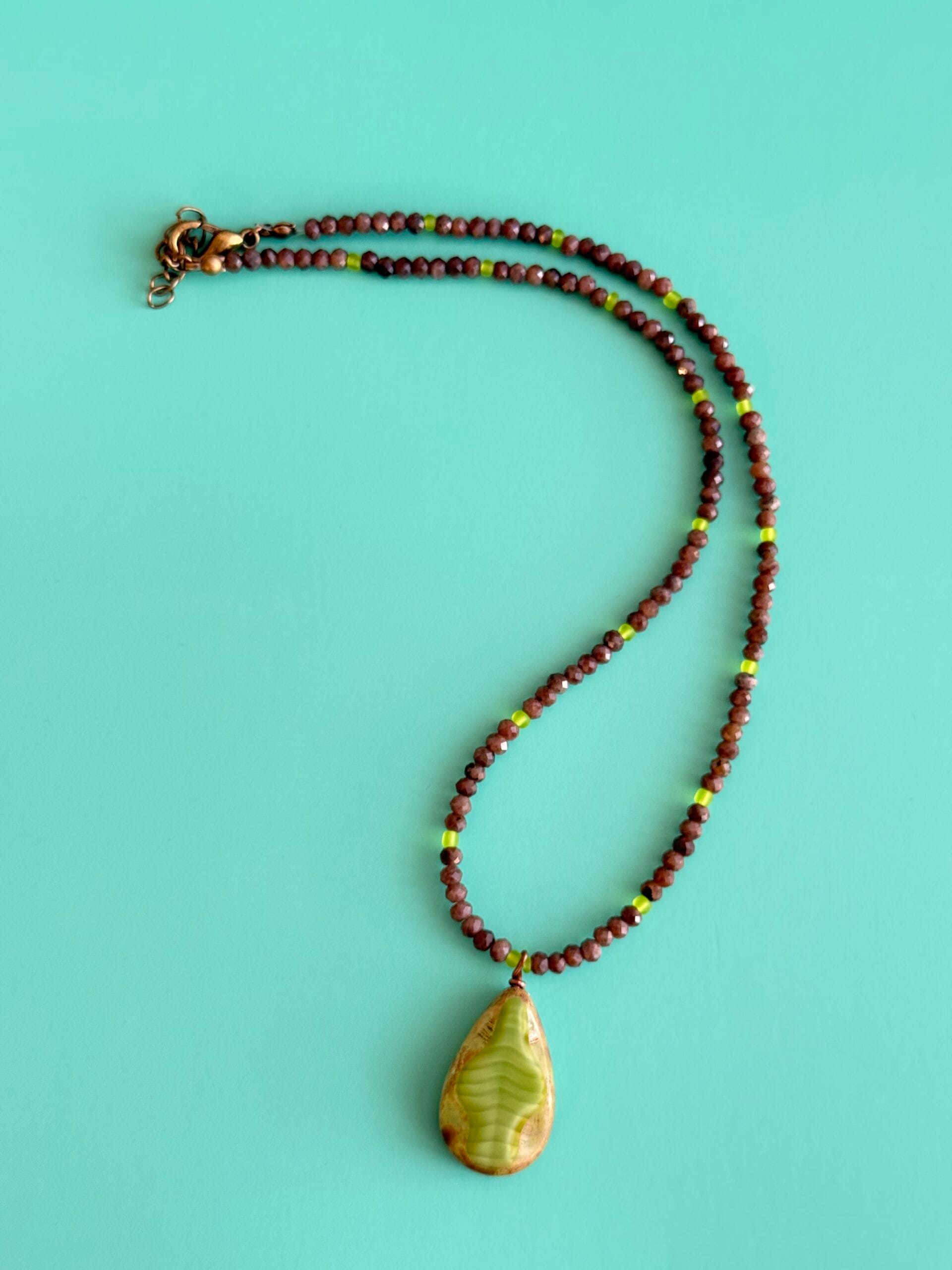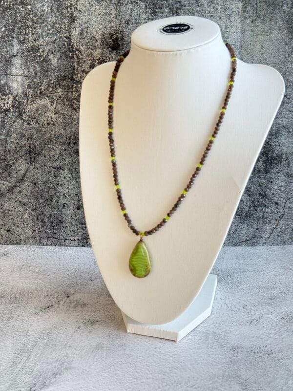 שרשרת בסגנון בוהו שיק עשויה חרוזי קריסטל בגוון חום ברונזה עם נגיעות בירוק ותליון זכוכית ירוק שמשתלב להפליא בלוק של השרשרת. פריט זה יחמיא לצאוורך ויעניק לך מראה מיוחד.