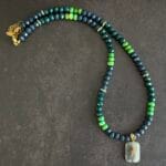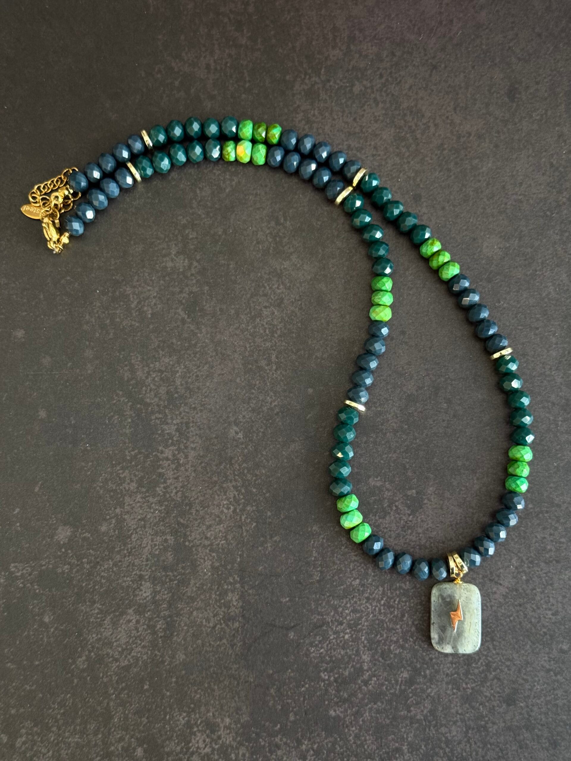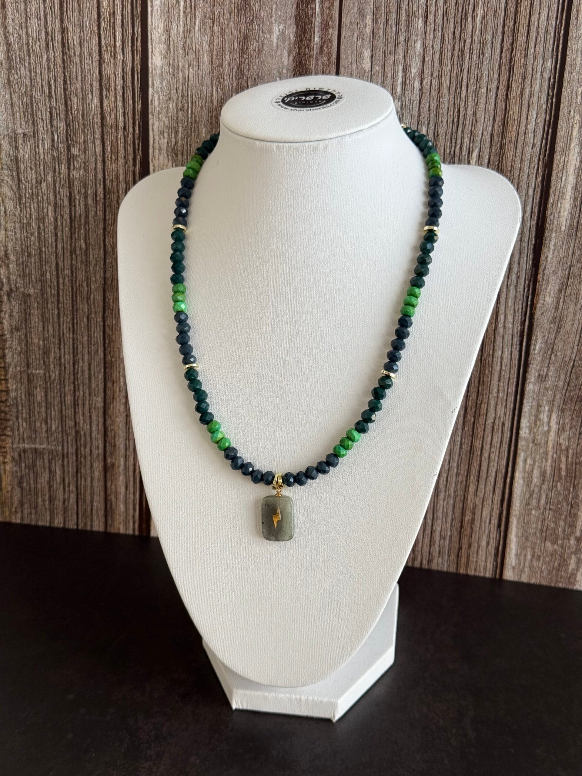 שרשרת עוצמתית המשלבת משחקי צבעים וטקסטורות בעבודת יד מוקפדת. השרשרת בנויה מחרוזי קריסטל בגווני ירוק בקבוק עמוק וירוק דשא רענן, המופרדים על ידי אלמנטים מוזהבים עדינים שמוסיפים יוקרה מאופקת.