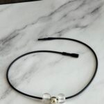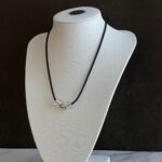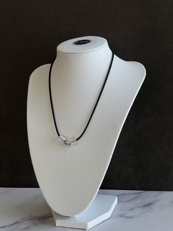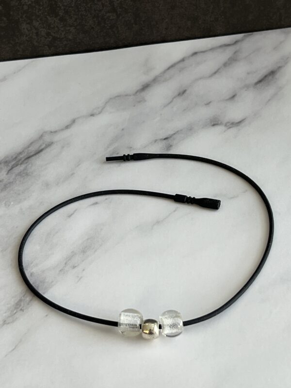 שרשרת עשויה חוט גומי שחור קלה לפתיחה וסגירה עם חרוזי זכוכית שקופים.