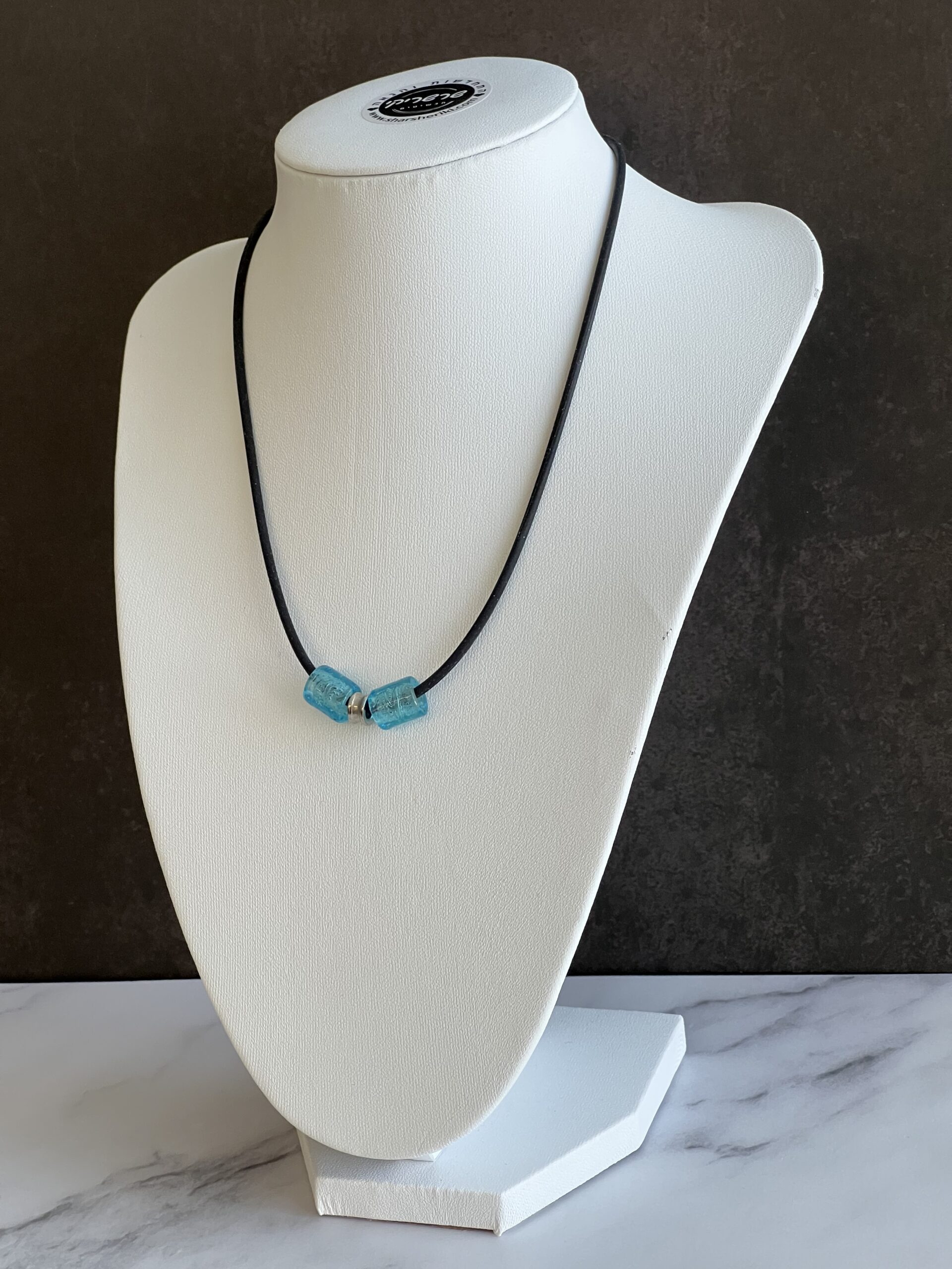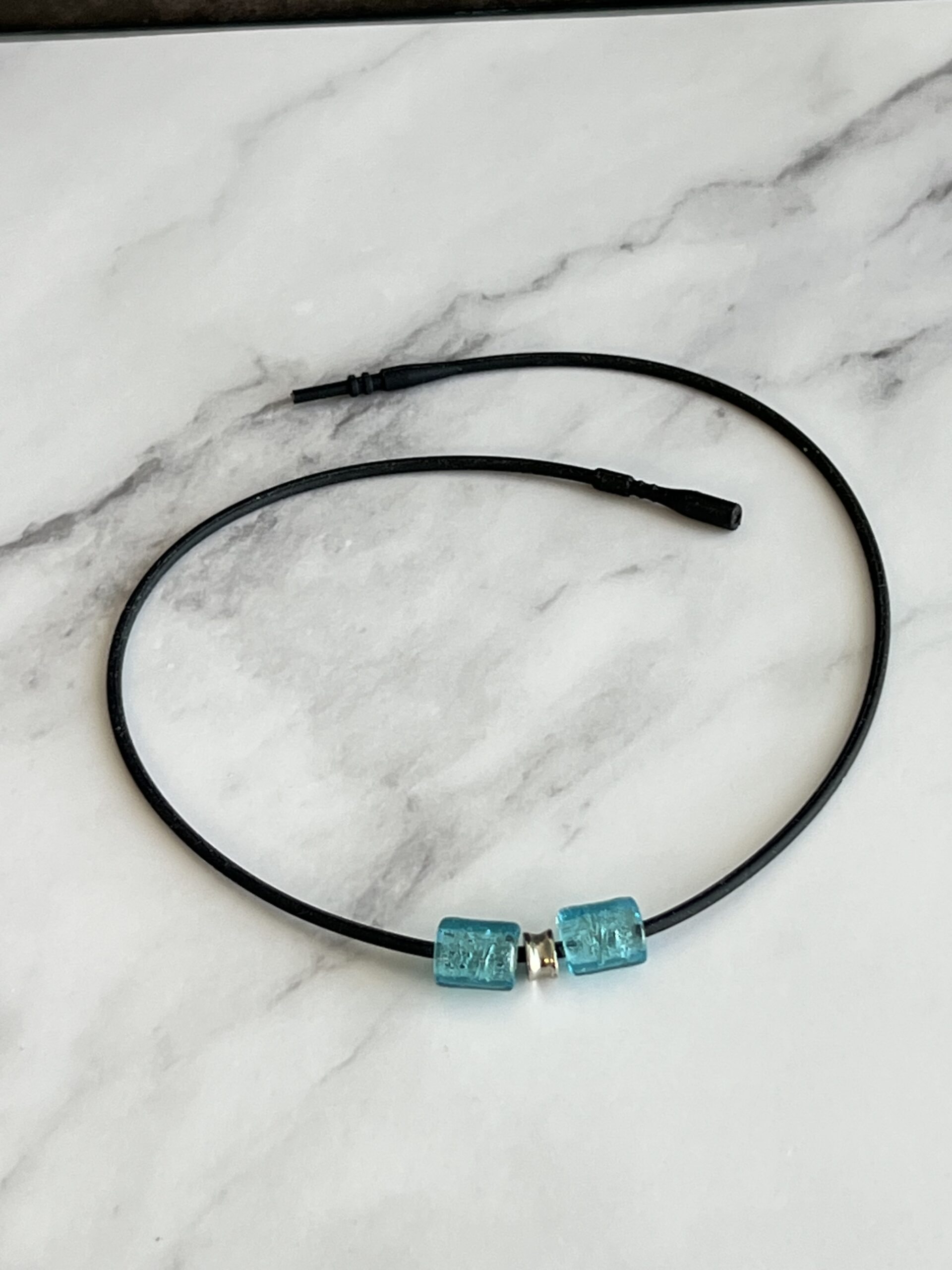 שרשרת עשויה חוט גומי שחור קלה לפתיחה וסגירה עם חרוזי זכוכית בגוון תכלת.