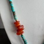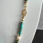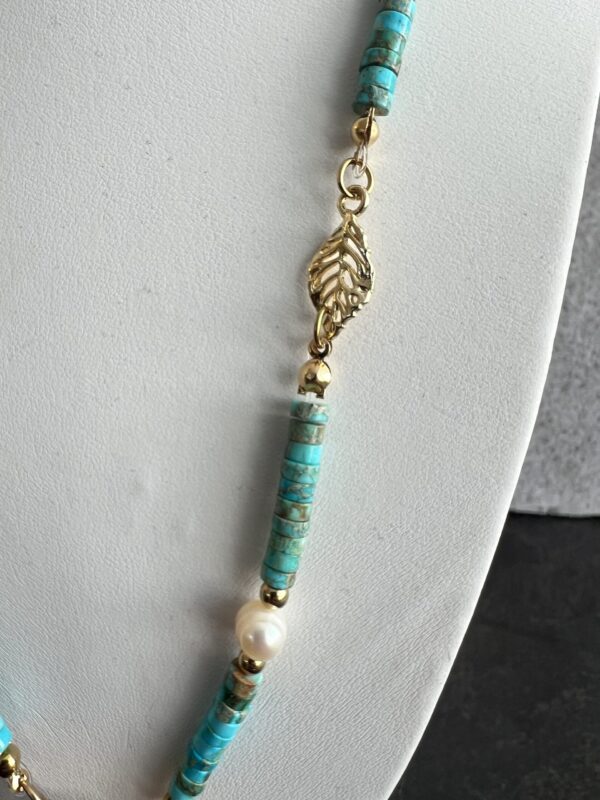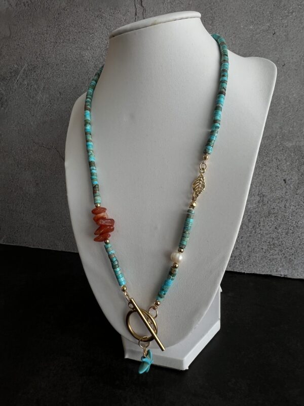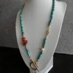 שרשרת מתוחכמת עשויה מאבני ג׳אספר שטוחות בשילוב פנינה מתורבתת קלאסית, אלמנט עלה מוזהב ואבני חן פראיות קורנליאן בכתום.