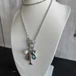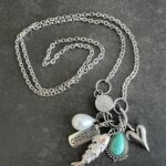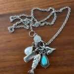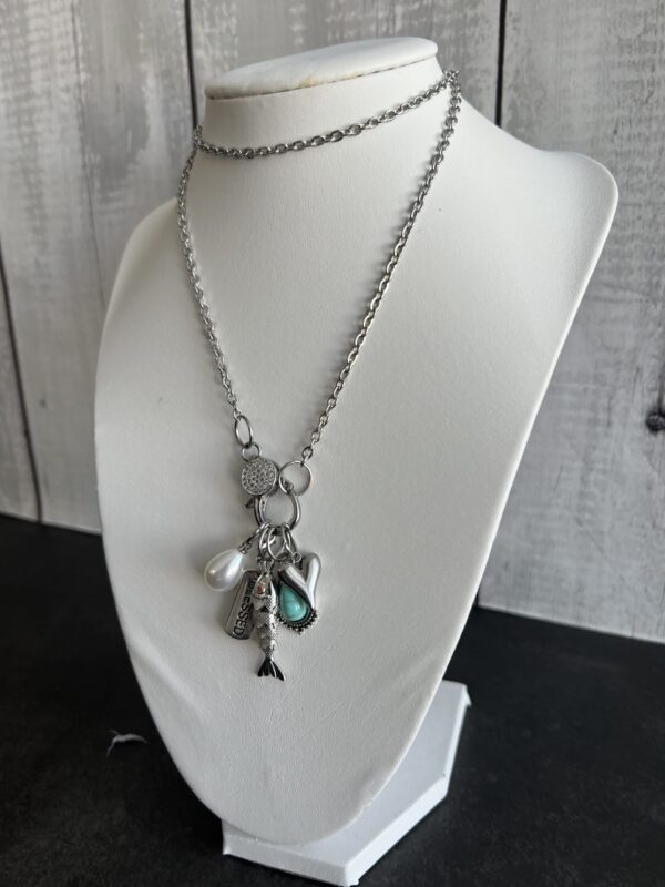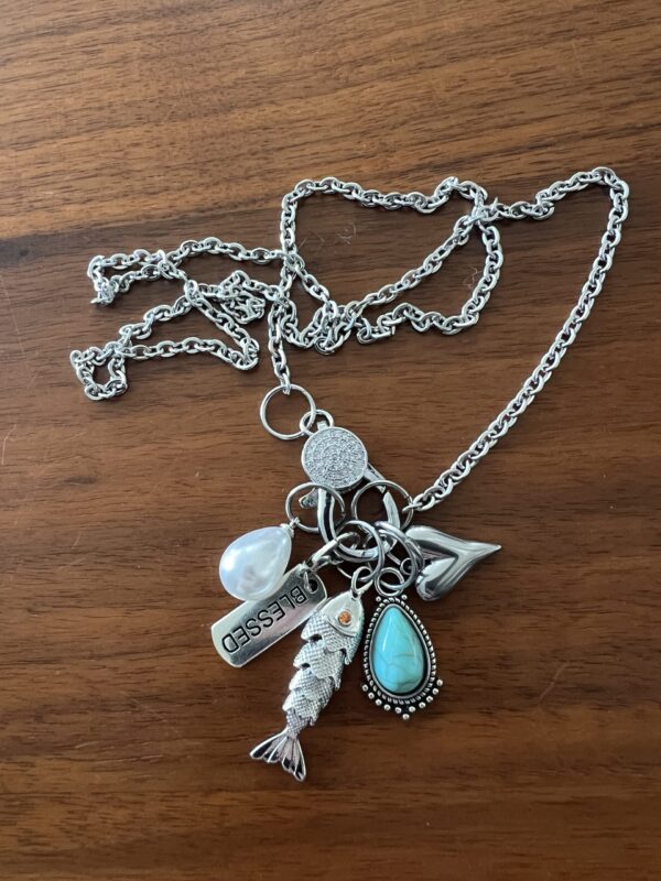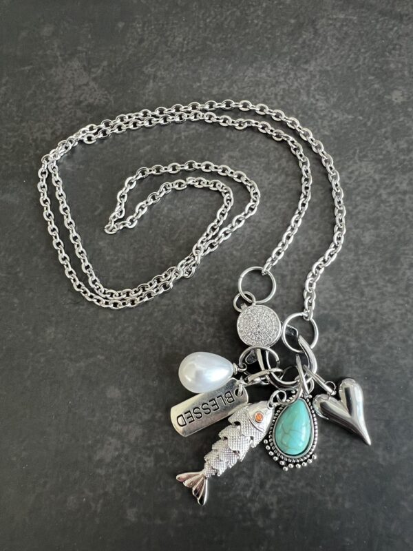 שרשרת השראה מלאת השראה ומשמעות באורך אמצע, מעל החזה – Mtinee – ועליה תליוני מזל: לב, דג, לוחית עם הכיתוב Blessed, פנינה, ותליון משובץ אבן בגוון טורקיז.