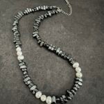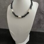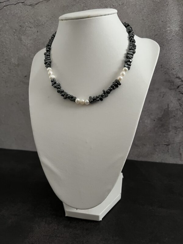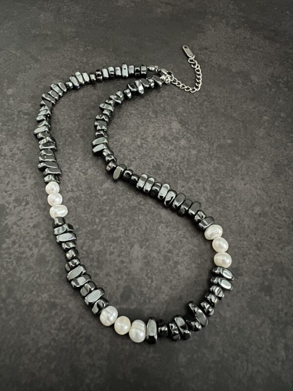שילוב עוצמתי בין אבני המטייט בגוון שחור-מטאלי לבין פנינים מתורבתות עדינות ולבנות. הניגוד בין שני החומרים יוצר מראה עכשווי ואלגנטי, עם משחק של טקסטורות וברק. מתאימה לנשים שאוהבות לשלב סטייל נועז ואלגנטיות טבעית.