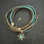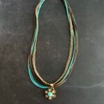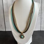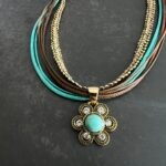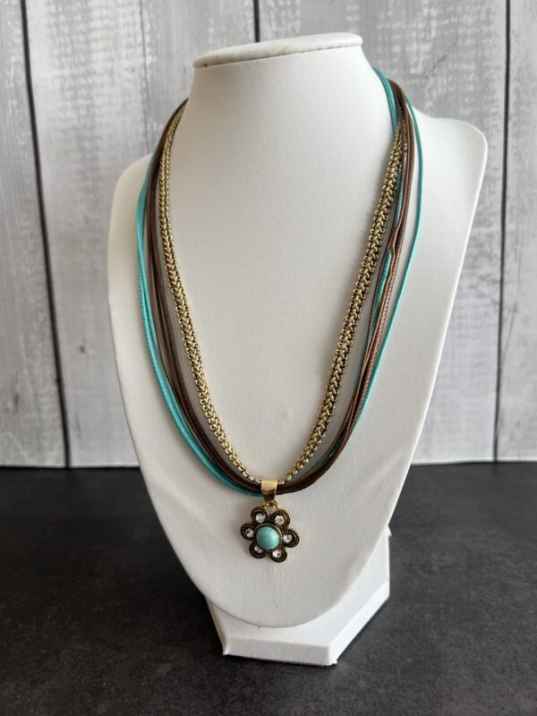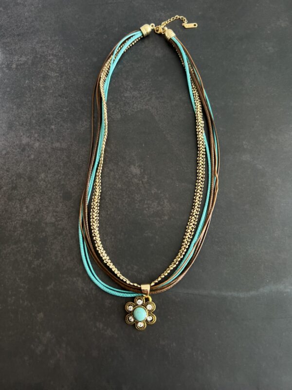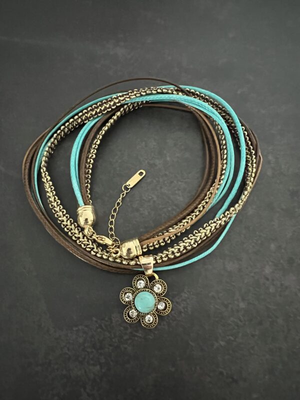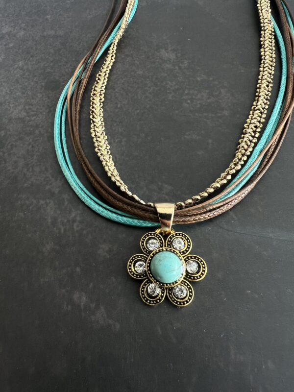 שרשרת חבלים בגווני טורקיז חום וזהב עם תליון פרח משובץ אבנים בסגנון וינטג׳ .