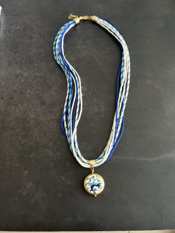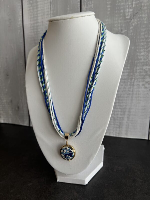 שרשרת חבלים בגווני כחול תכלת ולבן עם תליון חרוז אמנותי בסגנון סיני.