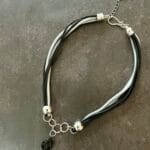 שרשרת עשויה חבל פוליאסטר שחור ואפור עם טלמנטים כסופים ותליון טיפה שחור.