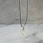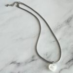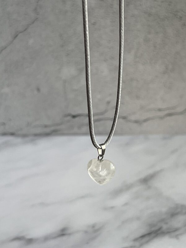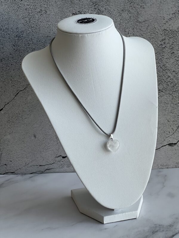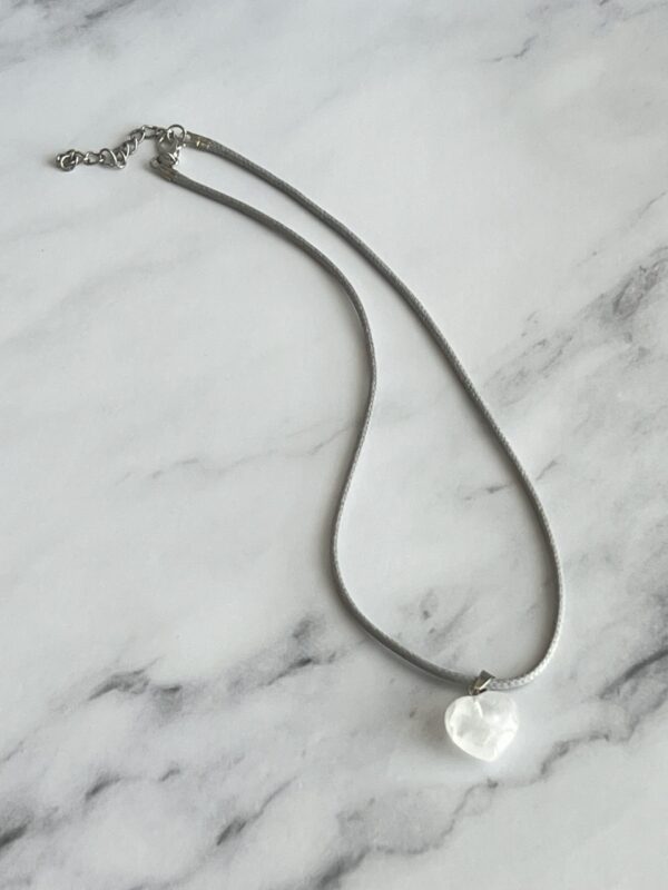 שרשרת שיקית עשויה חבל דמוי עור בגוון אפור עם לב מאבן קוורץ שקוף. השרשרת תחמיא ללוק שלך ותתאים לבד או עם שרשראות נוספות בשכבות.