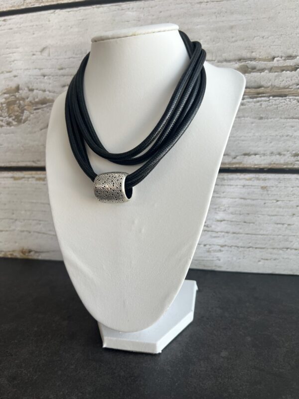 שרשרת חבל כפול בגוון שחור, היא שרשרת מרשימה מאוד וניתנת לענידה בשני מצבים, ארוך משוחרר ושיקי או מלופף כצ׳וקר חתיכי ומחמיא לצוואר.