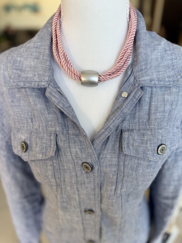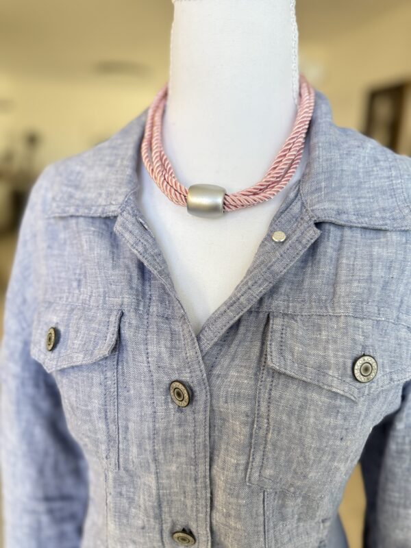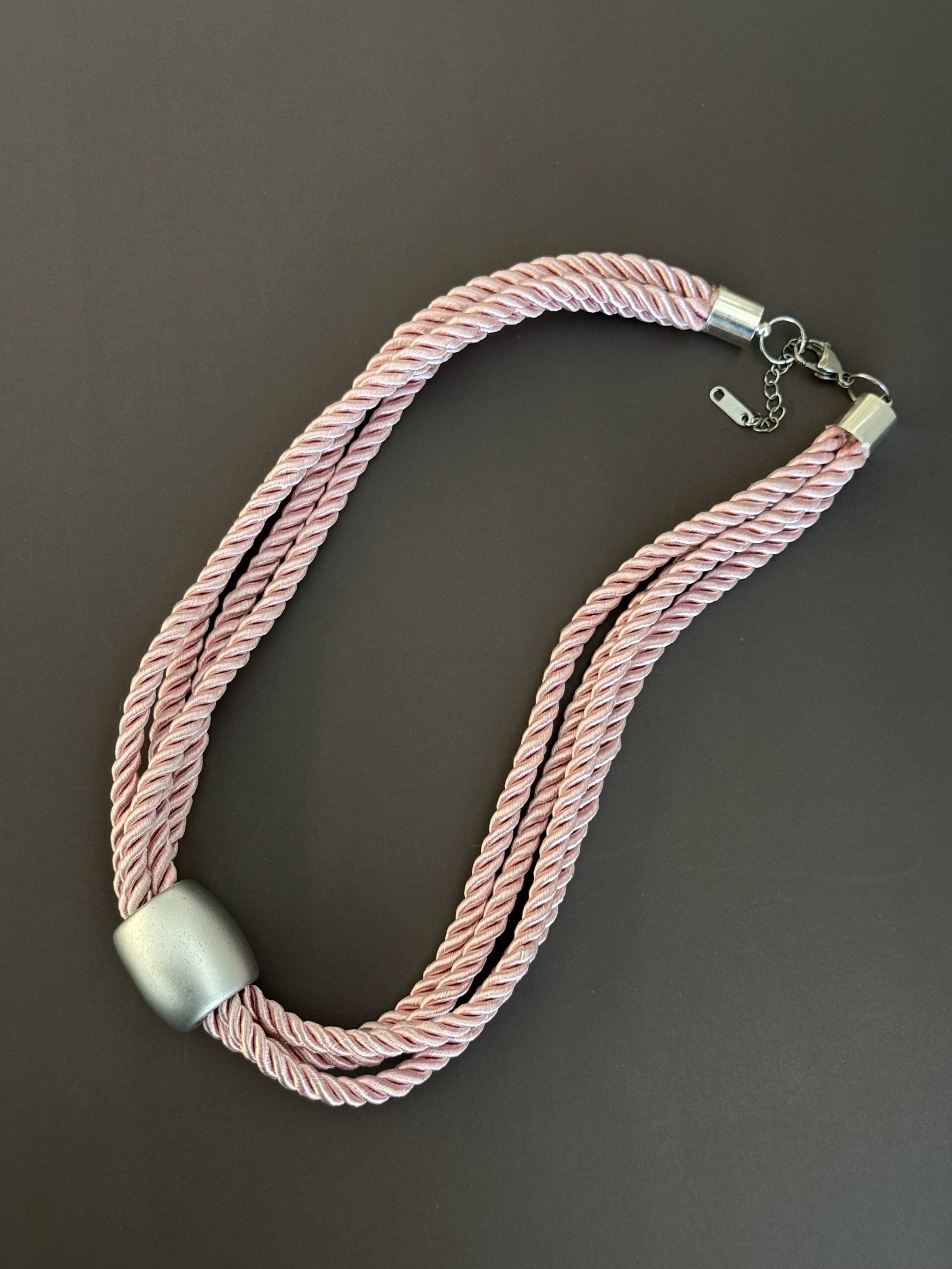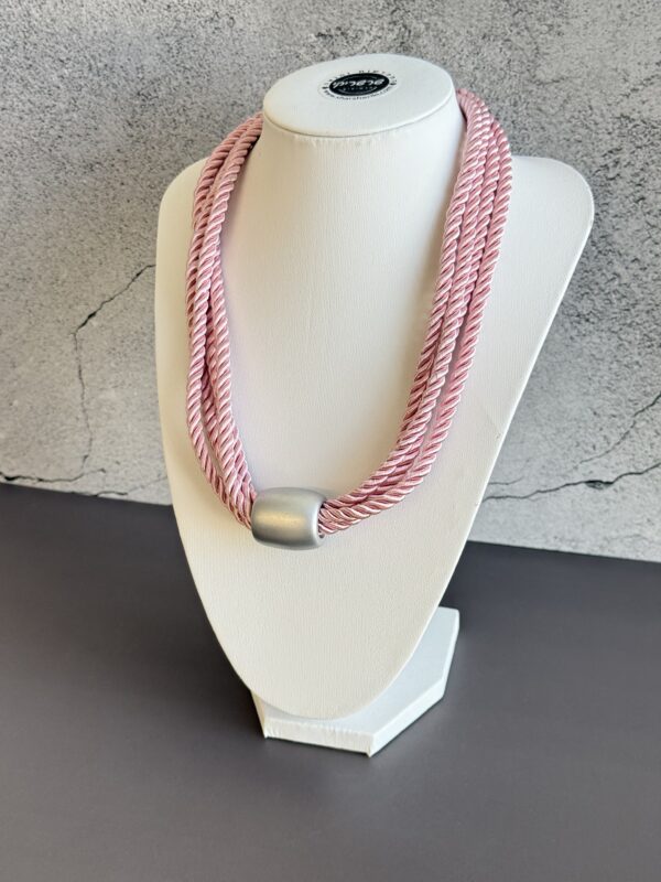 שילוב של חבל בגוון ורוד בהיר וטבעת צינור מרכזית במראה מט יוצרים משחק של טקסטורות ועומק, כזה שמושך את העין. זה תכשיט שמקפיץ לוק פשוט ברגע.
