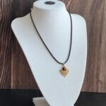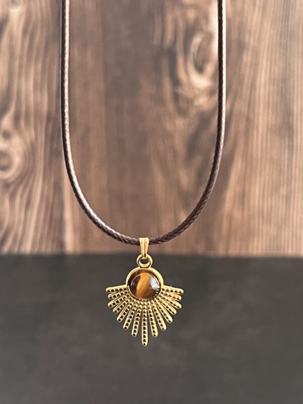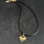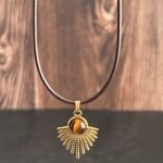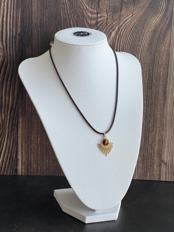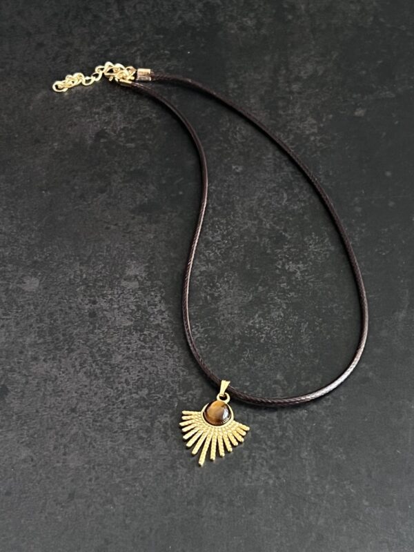 שרשרת עשויה חבל דמוי עור בצבע חום עם תליון מניפה מוזהב משובץ אבן עין הנמר.