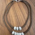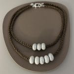 שרשרת עשויה חבל מלופף בצבע חום עם חרוזי פורצלן.