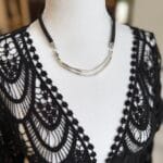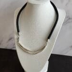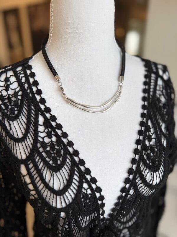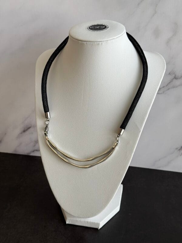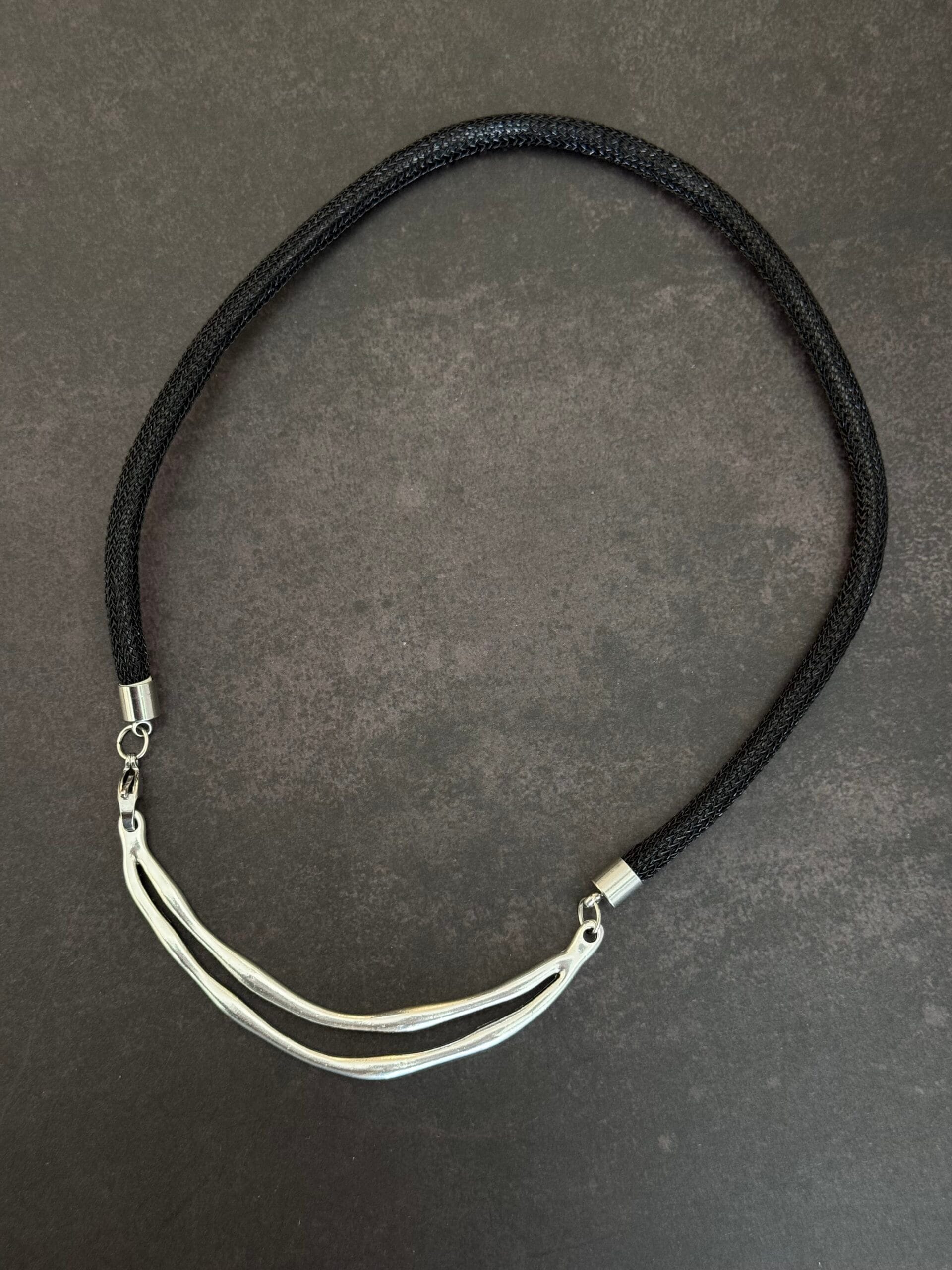 שרשרת עם קו מינימליסטי אבל מלא אופי: שילוב בין חוט שחור לבין אלמנט מתכתי זורם שמונח על עצם הבריח בצורה טבעית ומחמיאה.