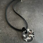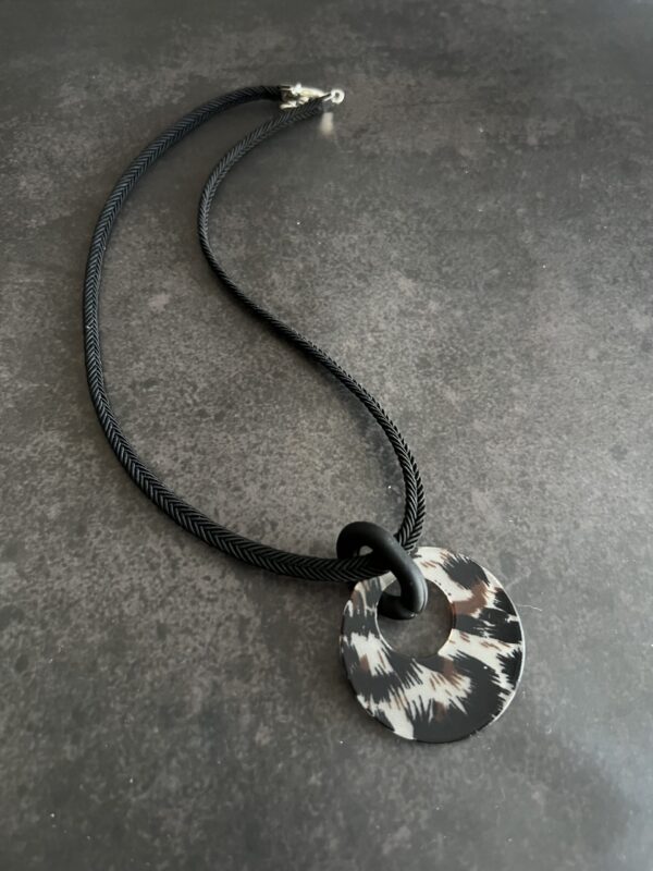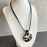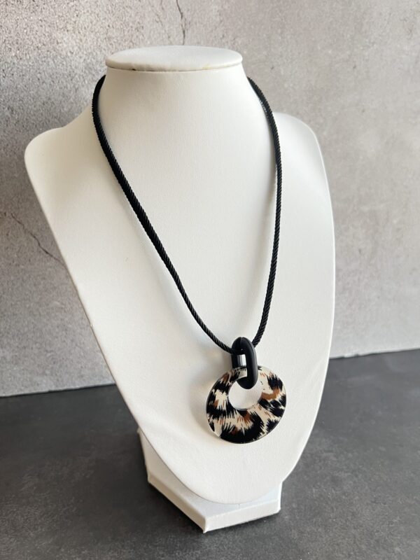 שרשרת חוט קלוע שחור עם תליון אקריל עגול מנומר חצי שקוף.