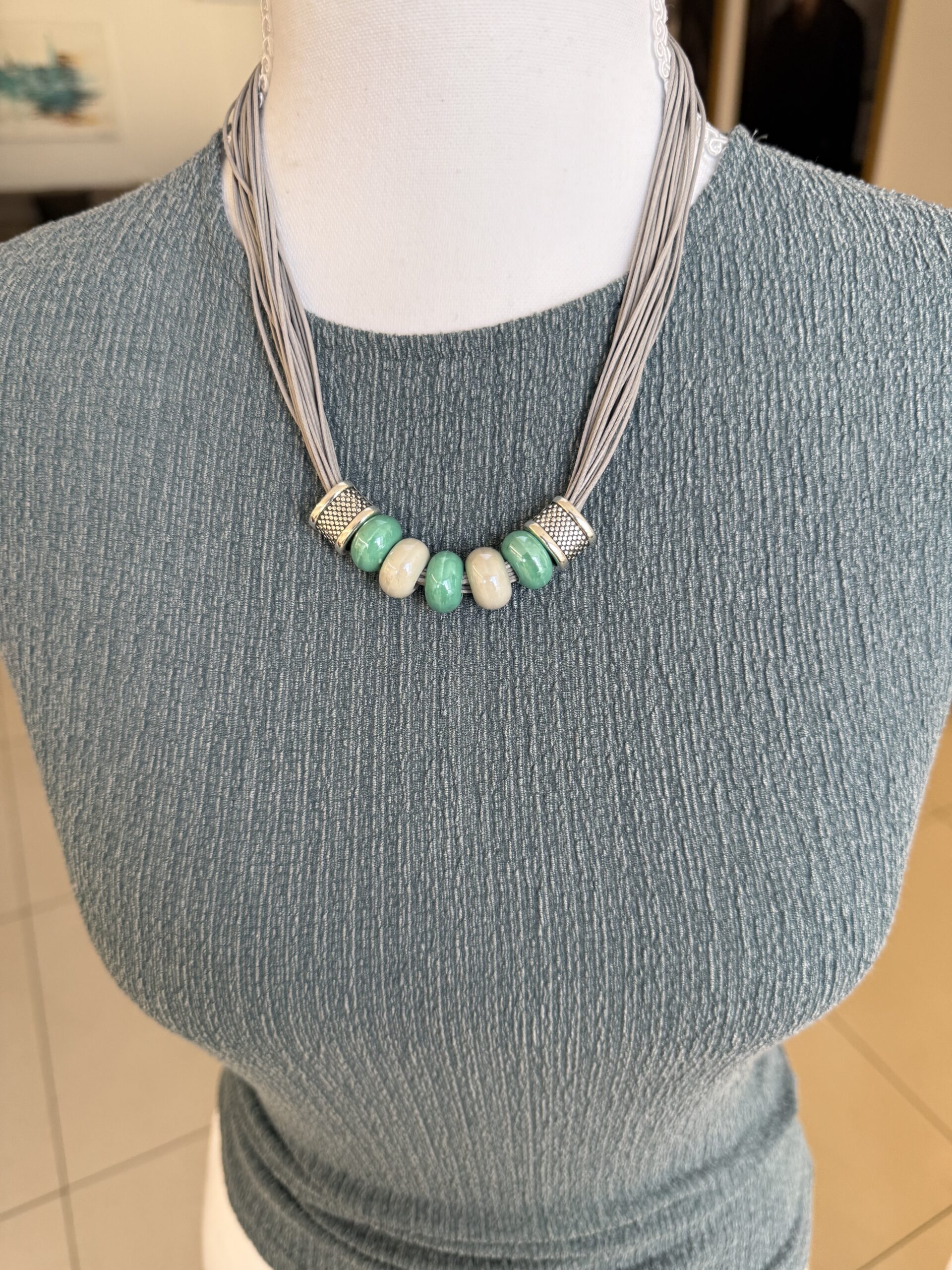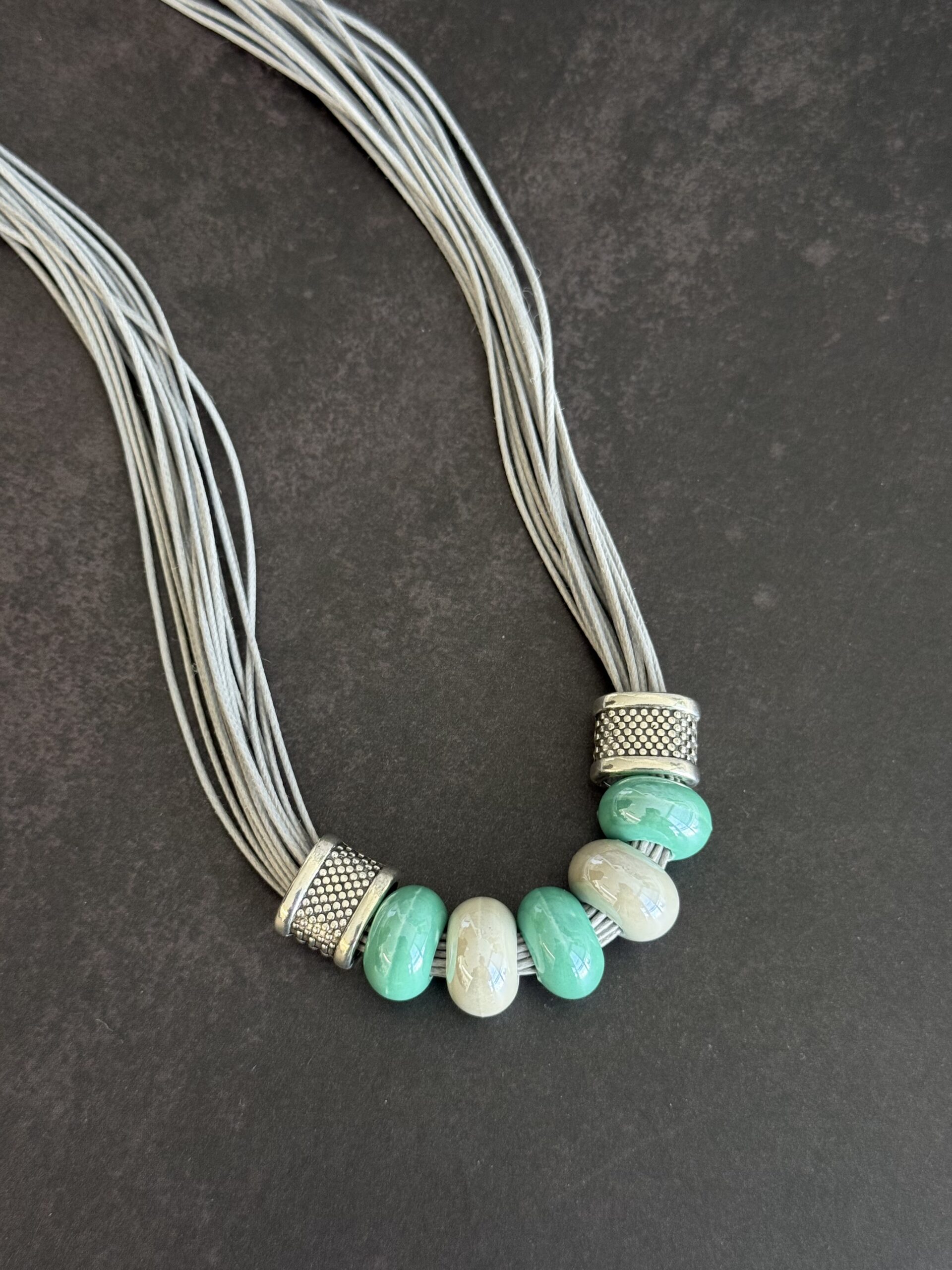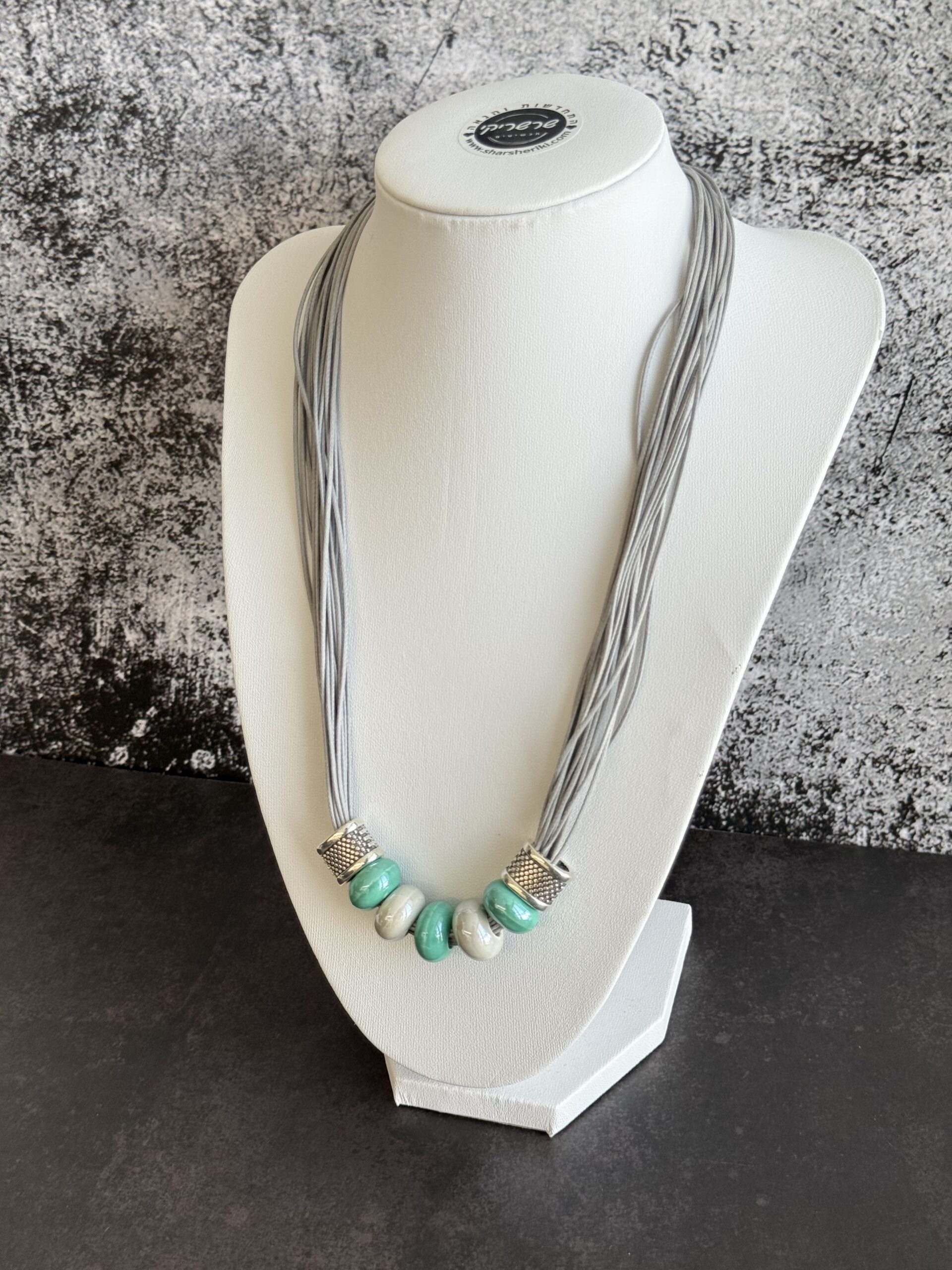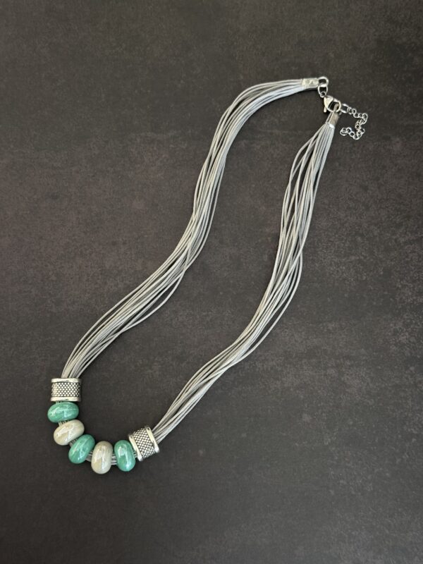 השרשרת מורכבת מרצועות חוט דקות , במראה דמוי עור בגוון אפור-כסוף, המעניקות לה נפח רך. במרכז משולבים חרוזי קרמיקה בצורת גליל, בגווני טורקיז-מנטה ושמנת. הסיומת של אלמנט החרוזים עשויה ממתכת בגימור מוברש (בסגנון כסף עתיק) עם טקסטורה מרוקעת.
