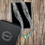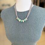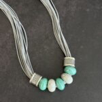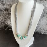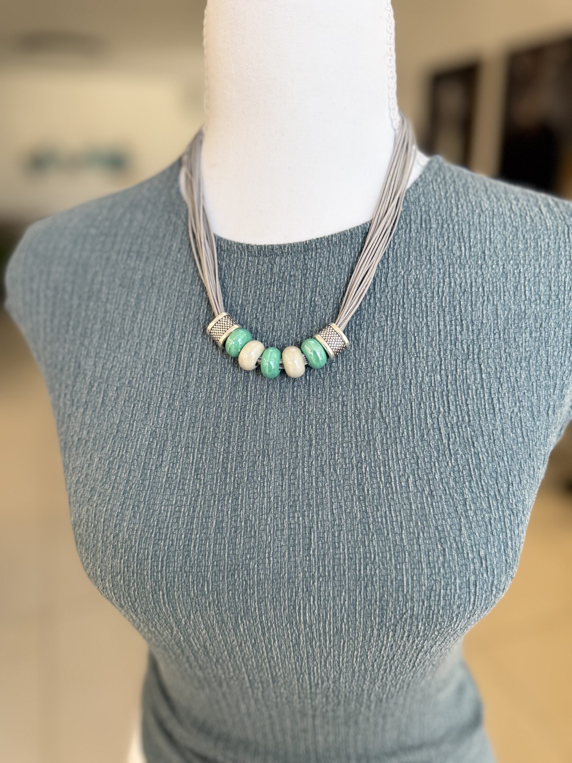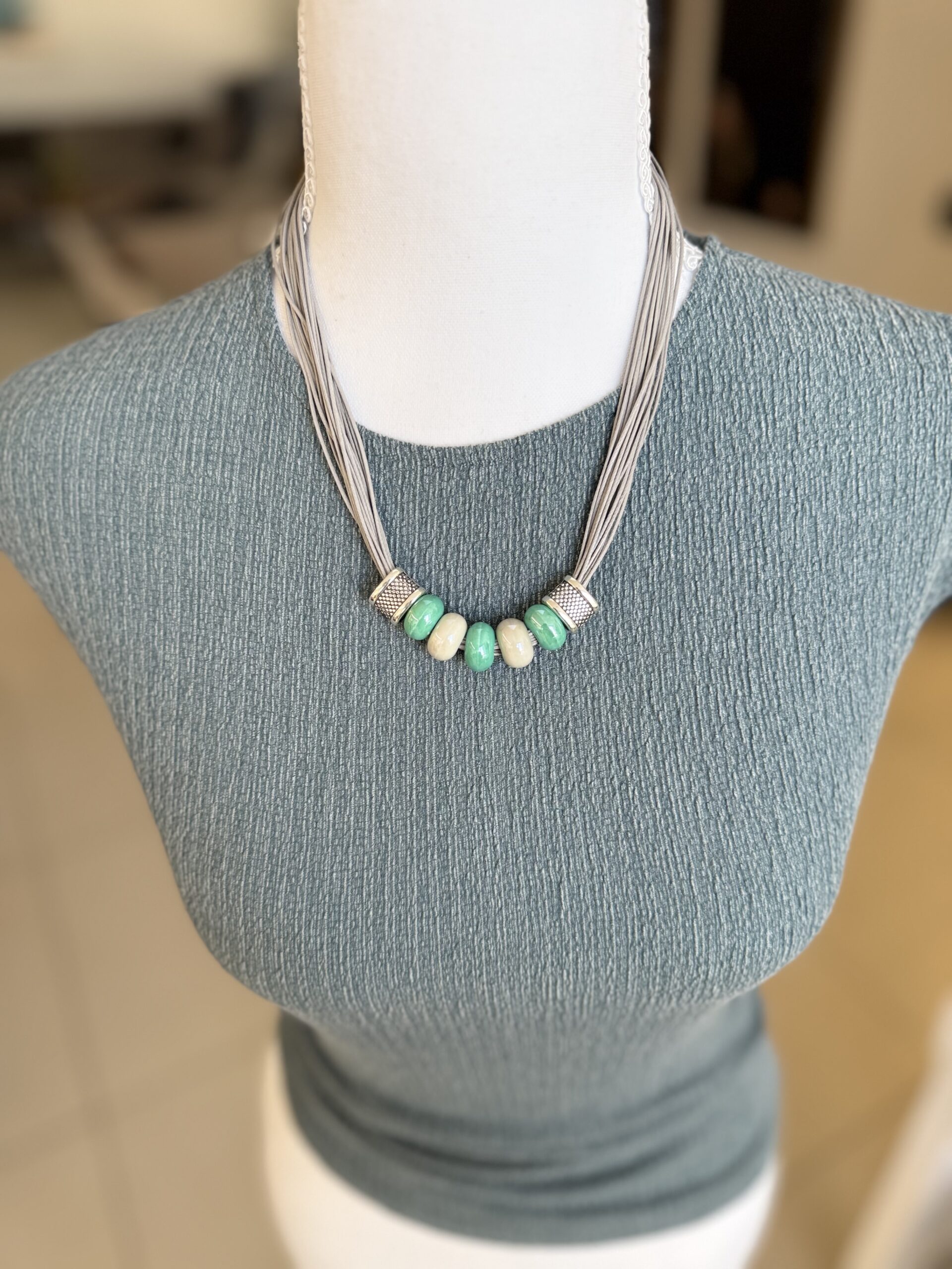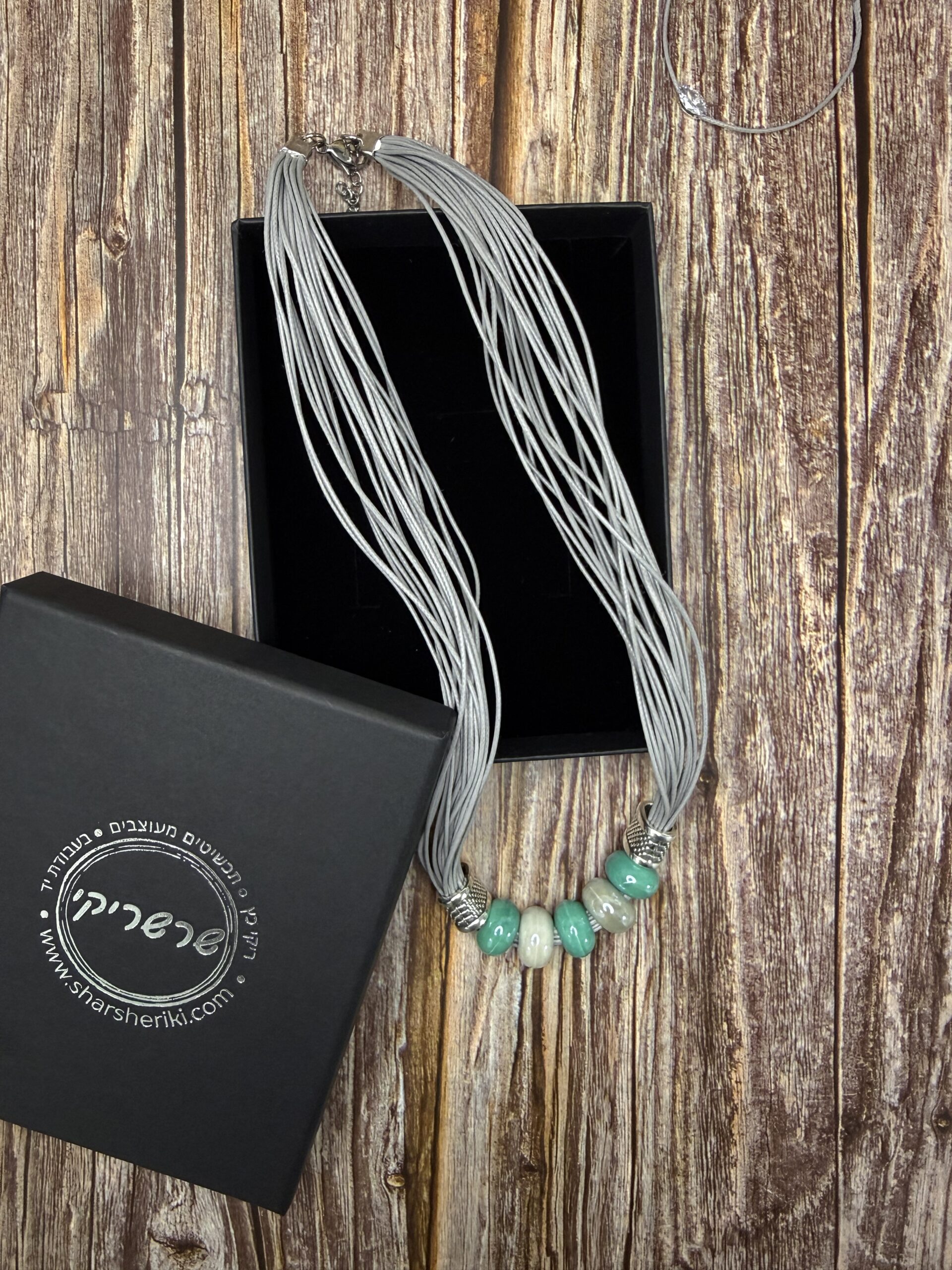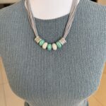 השרשרת מורכבת מרצועות חוט דקות , במראה דמוי עור בגוון אפור-כסוף, המעניקות לה נפח רך. במרכז משולבים חרוזי קרמיקה בצורת גליל, בגווני טורקיז-מנטה ושמנת. הסיומת של אלמנט החרוזים עשויה ממתכת בגימור מוברש (בסגנון כסף עתיק) עם טקסטורה מרוקעת.