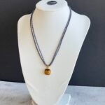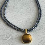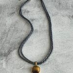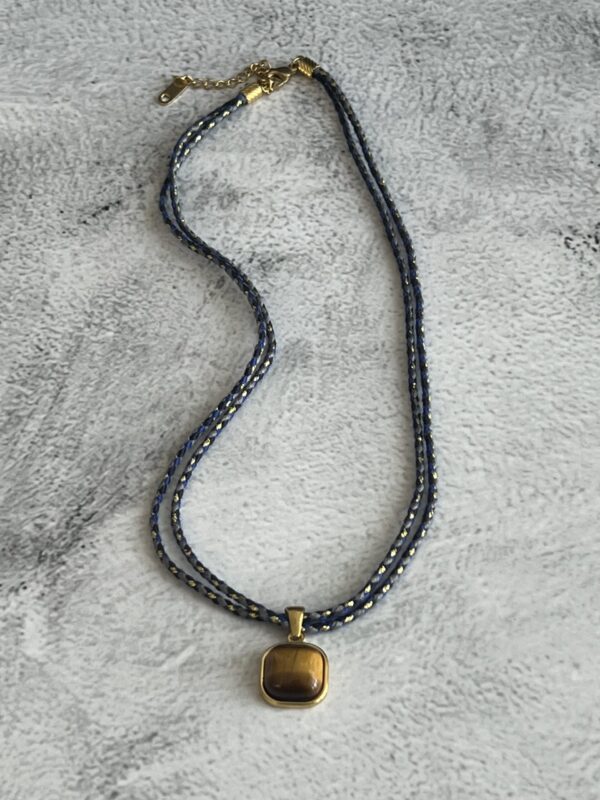 שרשרת עשויה חוט כחול עם נגיעות זהב עם תליון מוזהב משובץ אבן עין הנמר.
