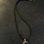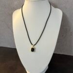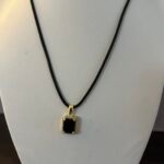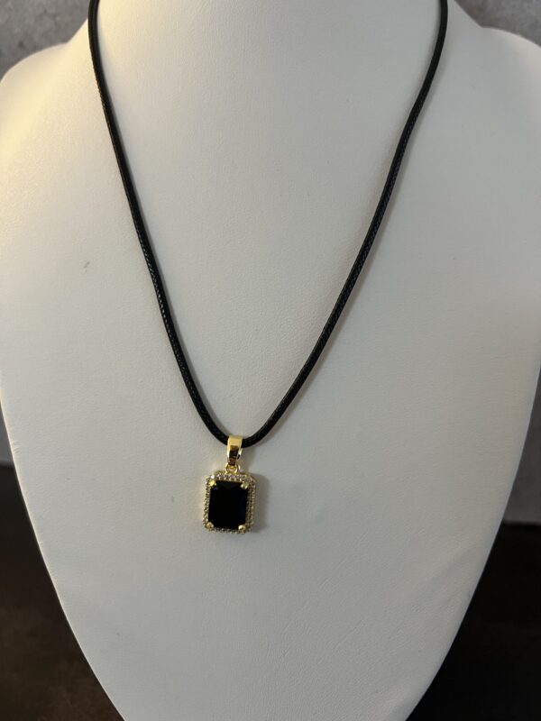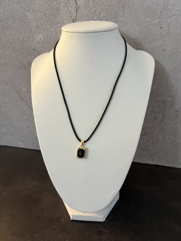 שרשרת חוט דמוי עור שחור  עם תליון מרקיזה מלבני משובץ אבן מרכזית שחורה וזירוקנים.