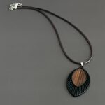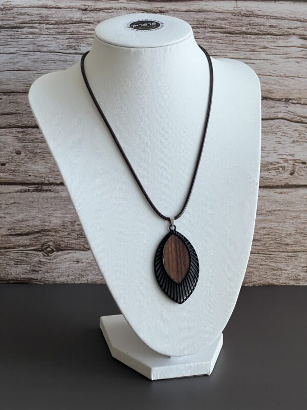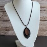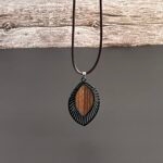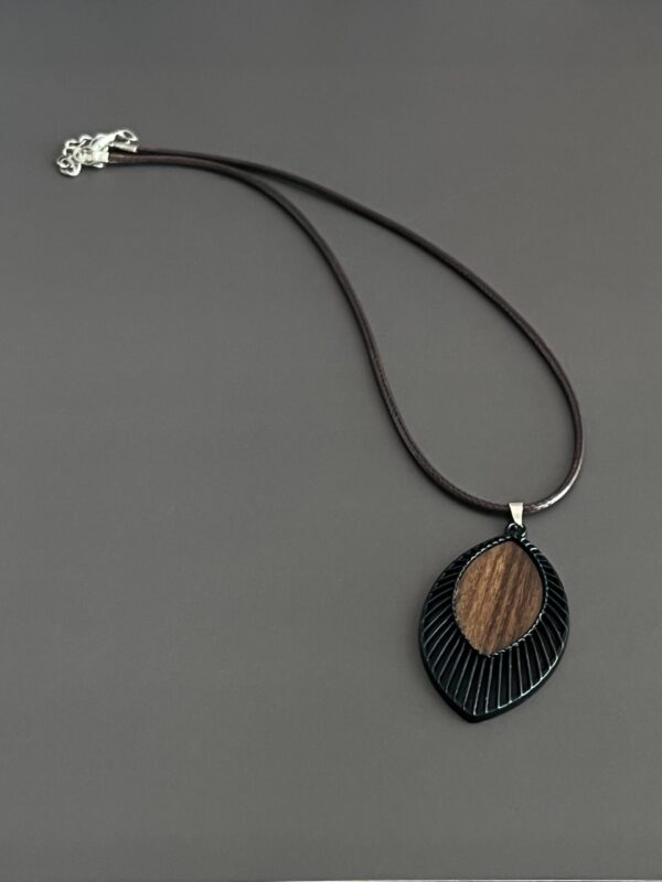 שרשרת עדינה, חוט דמוי עור חום עם תליון טיפה עשוי עץ ומתכת.