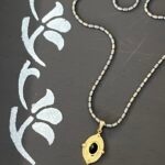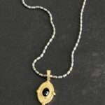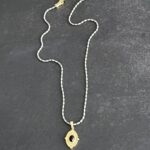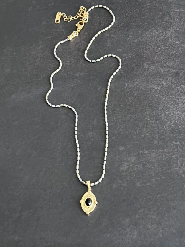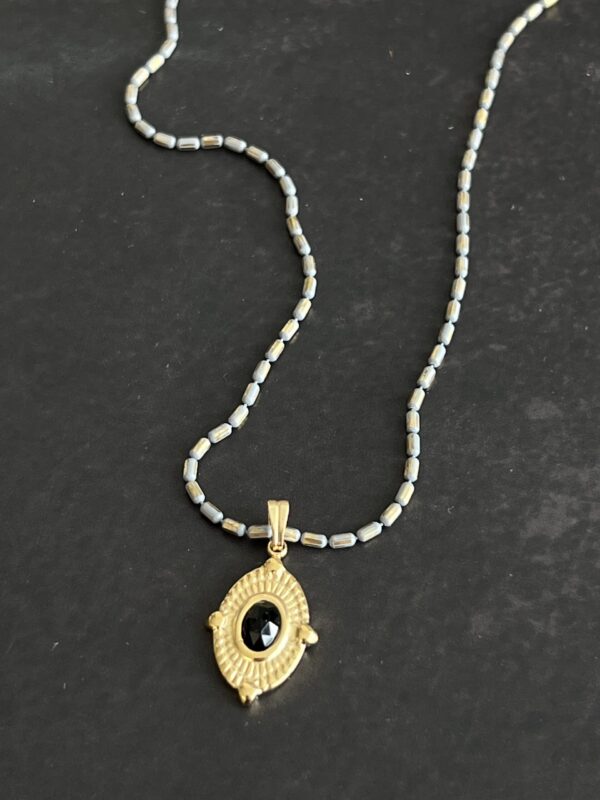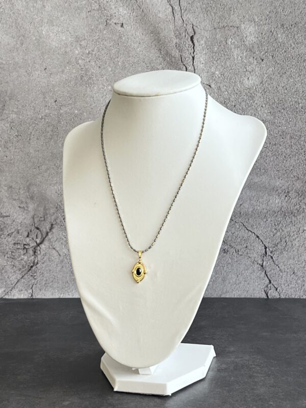 שרשרת אלגנטית עם נוכחות עדינה, המעוצבת בעבודת יד עשויה שרשרת חוליות אפורה מוזהבת עם תליון עין עם אבן שחורה.