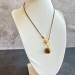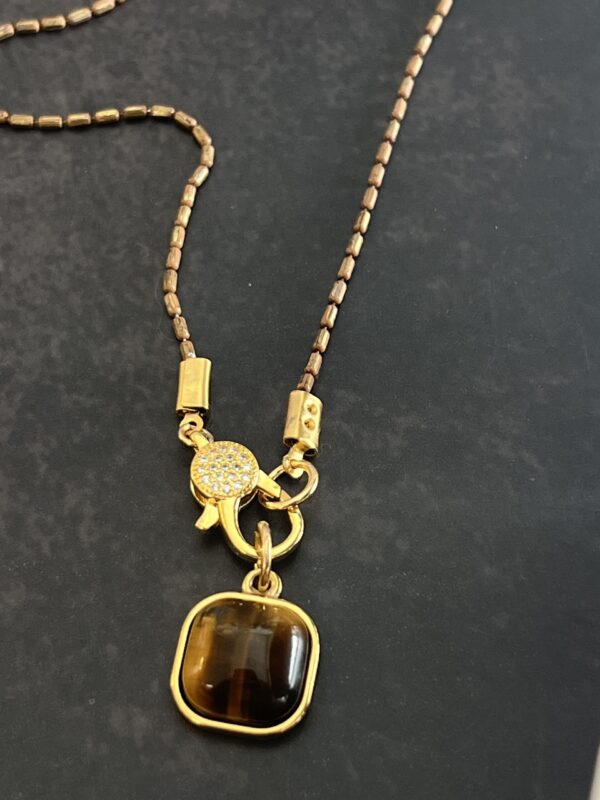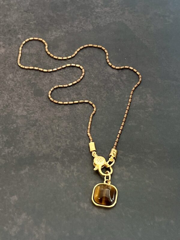 שרשרת אלגנטית עם נוכחות עדינה, המעוצבת בעבודת יד עשויה שרשרת חוליות ותליון ריבועי משובץ אבן עין הנמר בגוון חום.