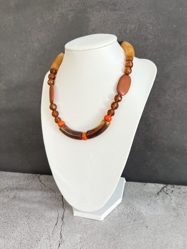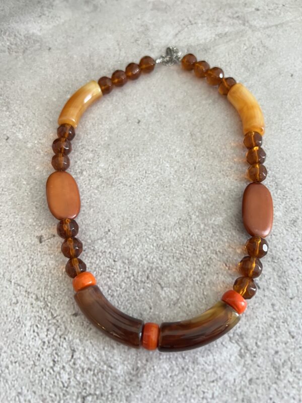שרשרת קצרה צמודה עשויה חרוזי אקריל וקריסטל בגווני חום כתום וצהוב. תשתלב נהדר עם צבעי החורף החמים ותשדרג את הלוק .