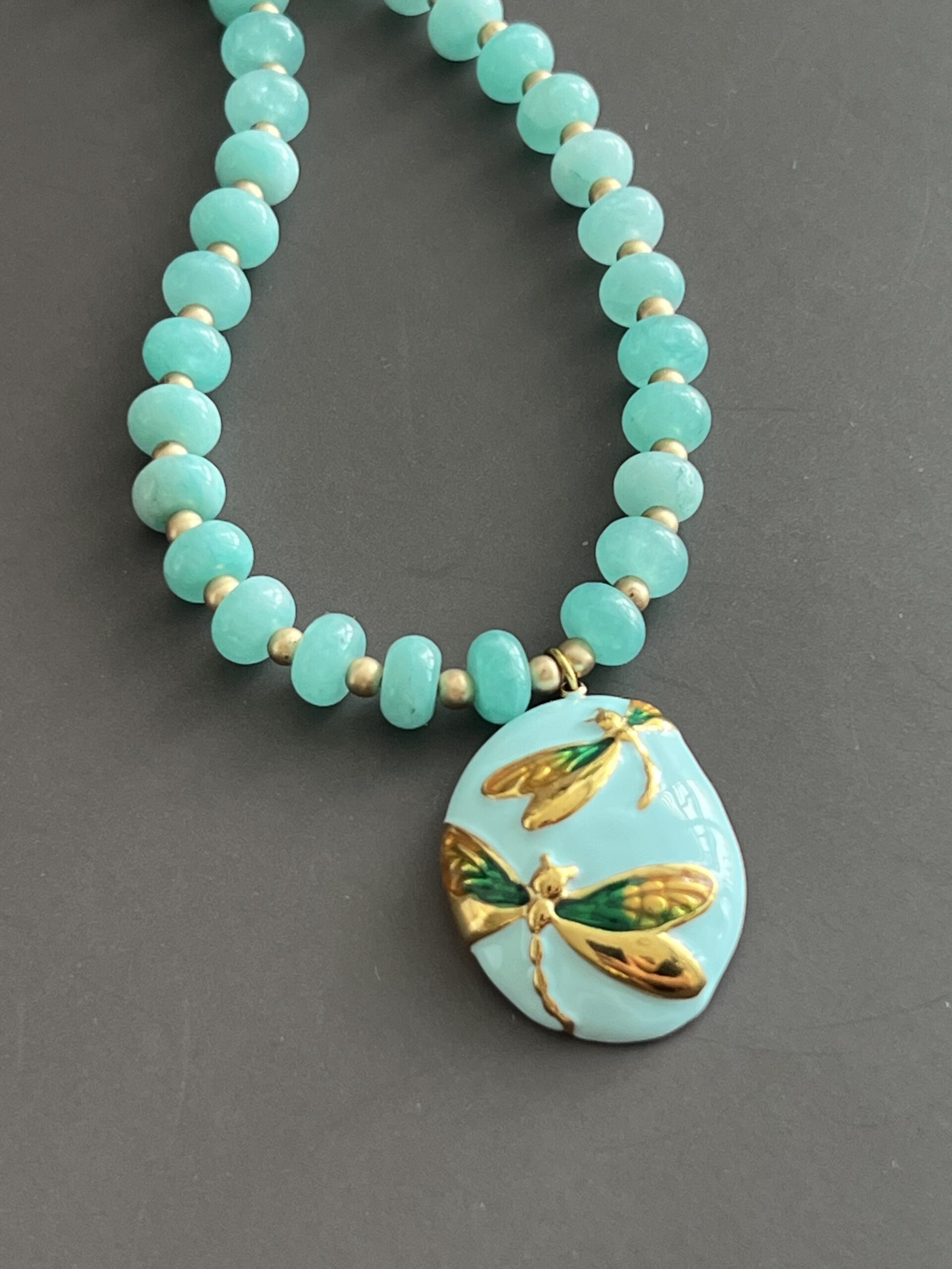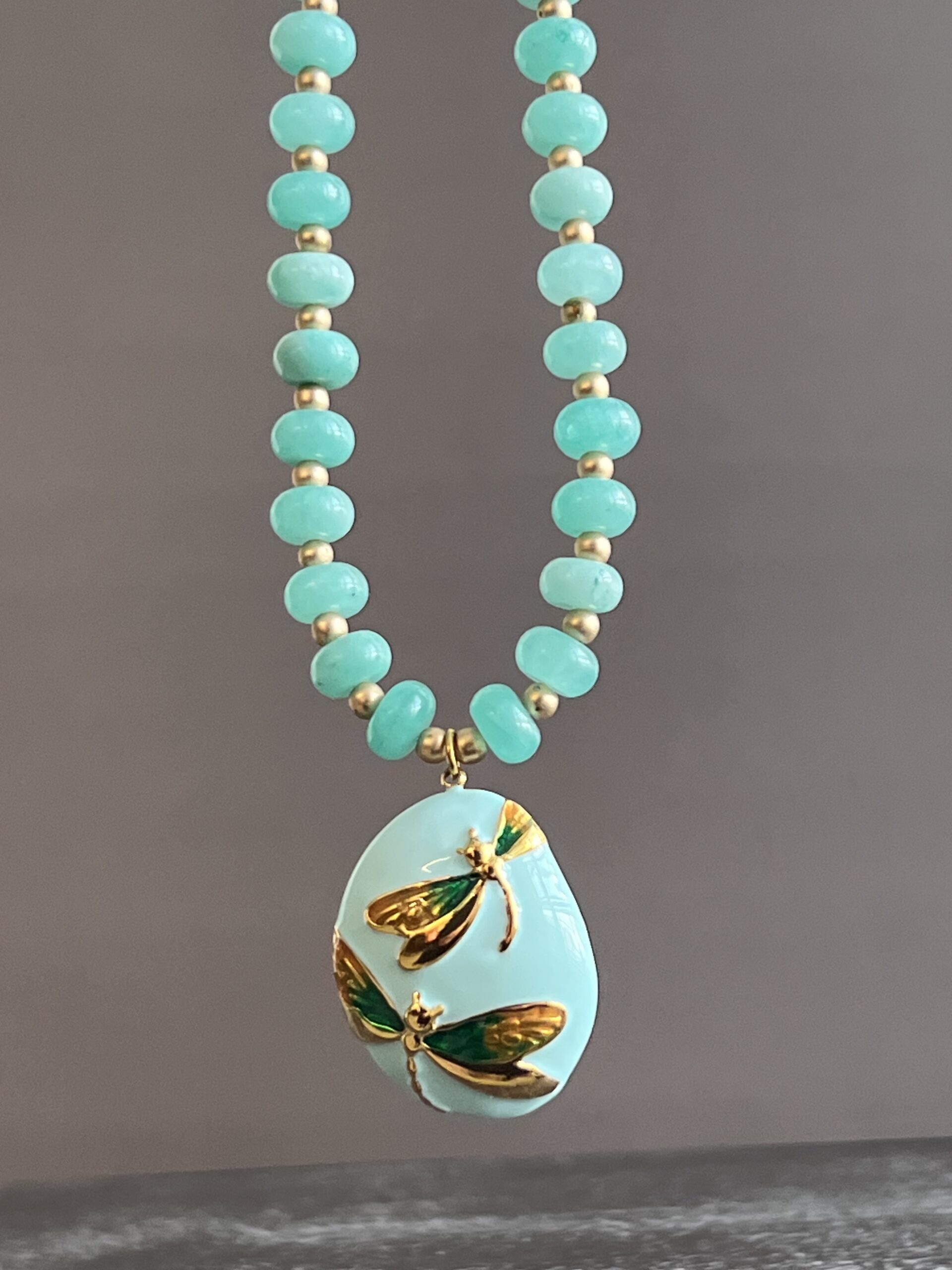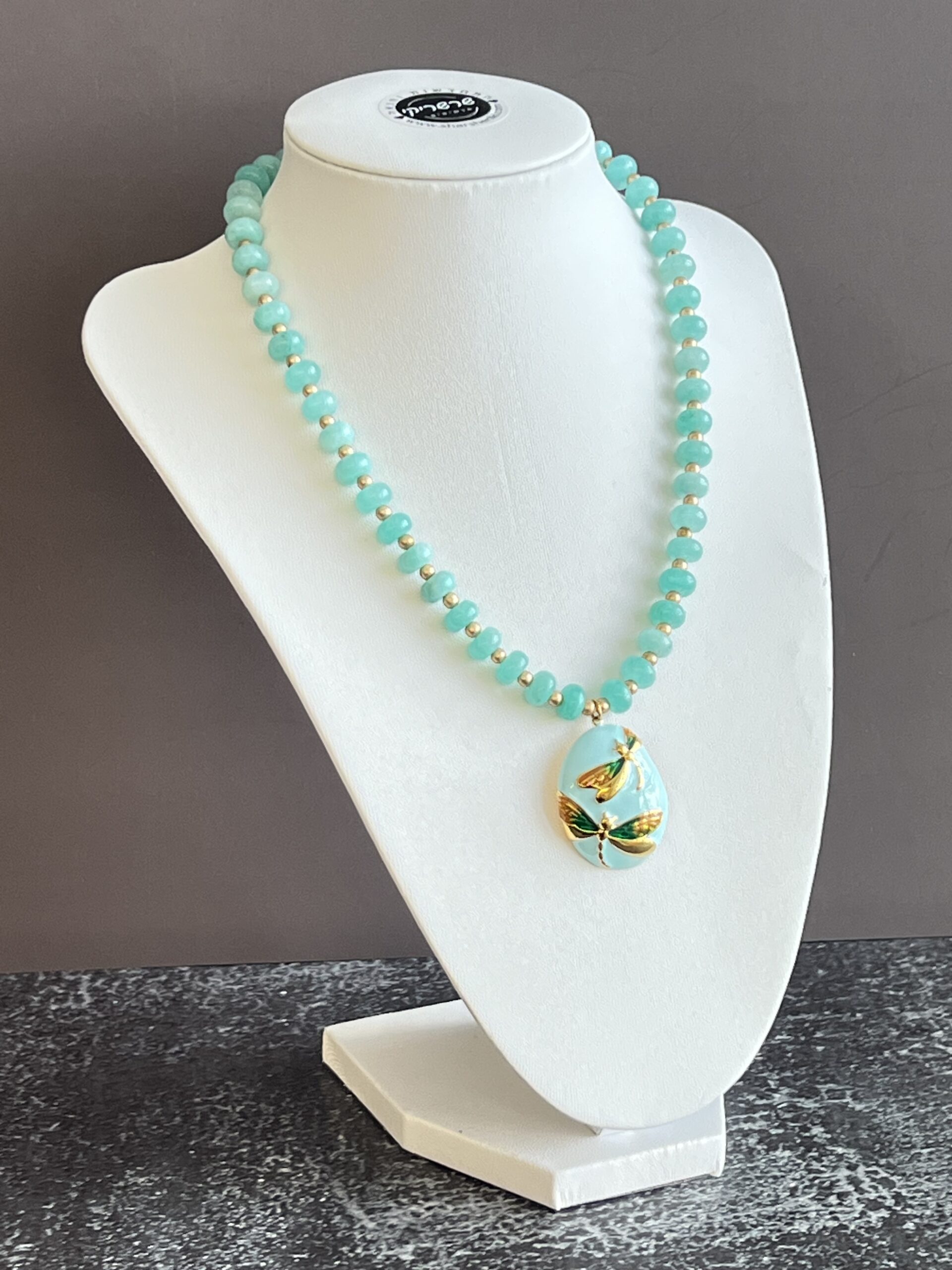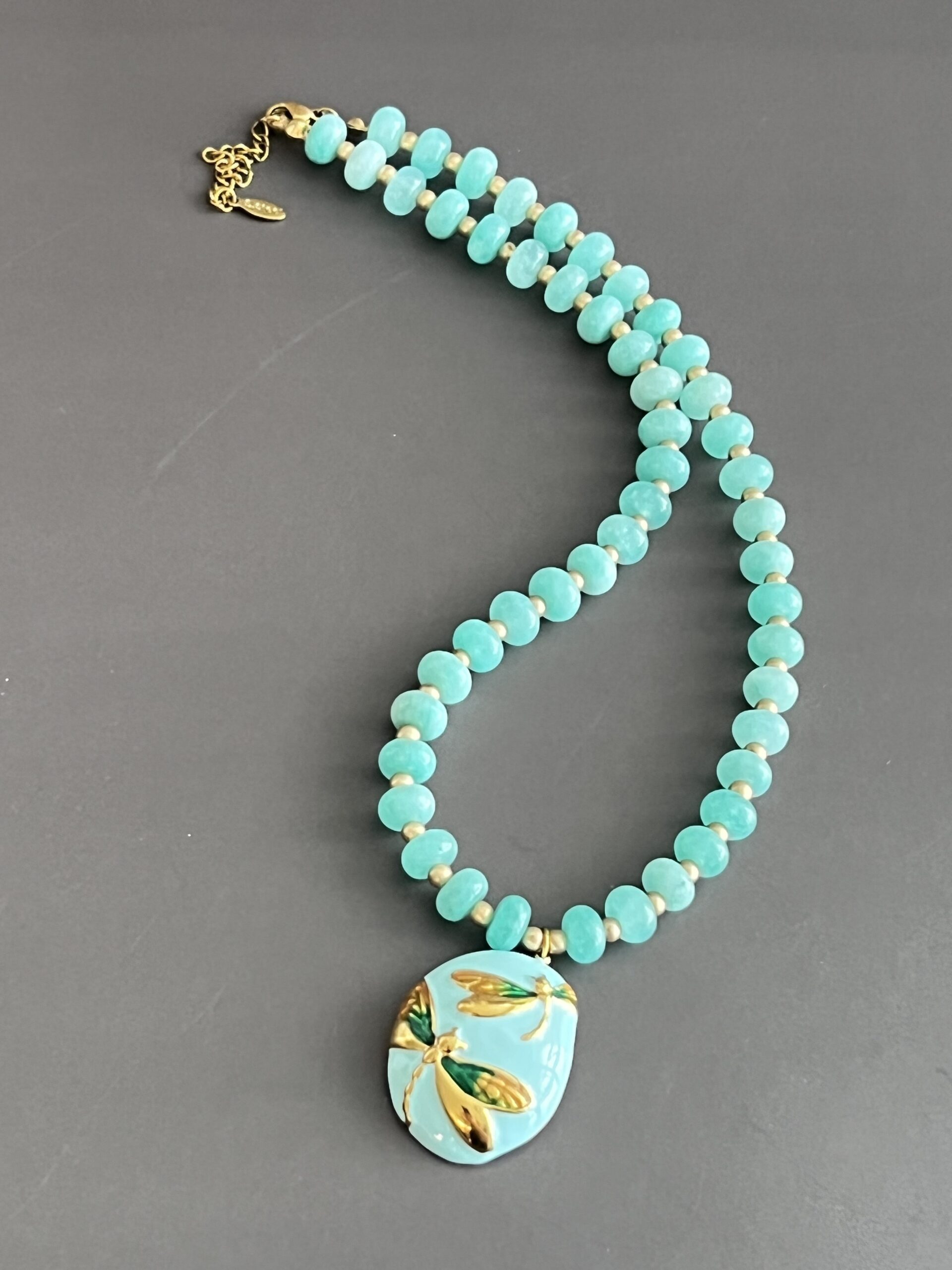 שרשרת עשויה חרוזי זכוכית בגוון טורקיז בשילוב חרוזי המטייט בזהב מט עם תליון אמייל מעוטר בשפירית .