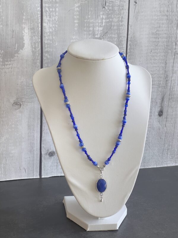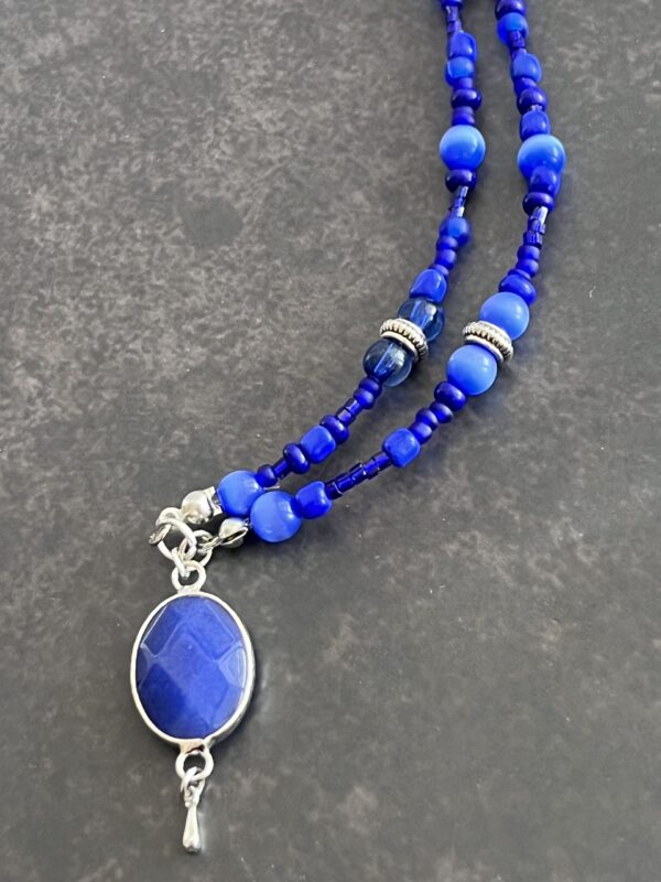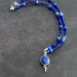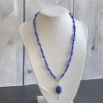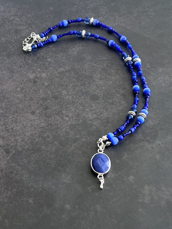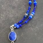 שרשרת חרוזים בגוונים כחולים עם תליון אבן חן במסגרת כסופה.