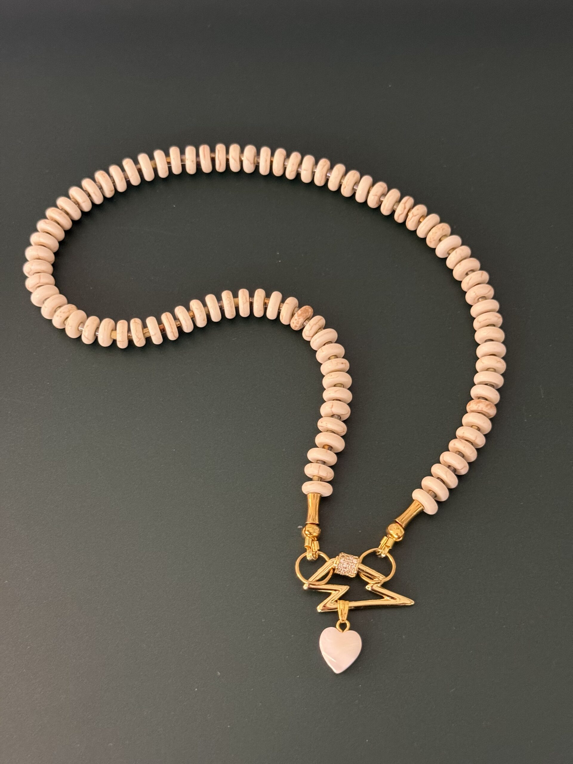 שרשרת חרוזים שטוחים בגוון אבן טבעית שנסגרת מלפנים עם קרבינה מיוחדת מוזהבת ומשובצת אבנים ועליה תליון לב צדף.