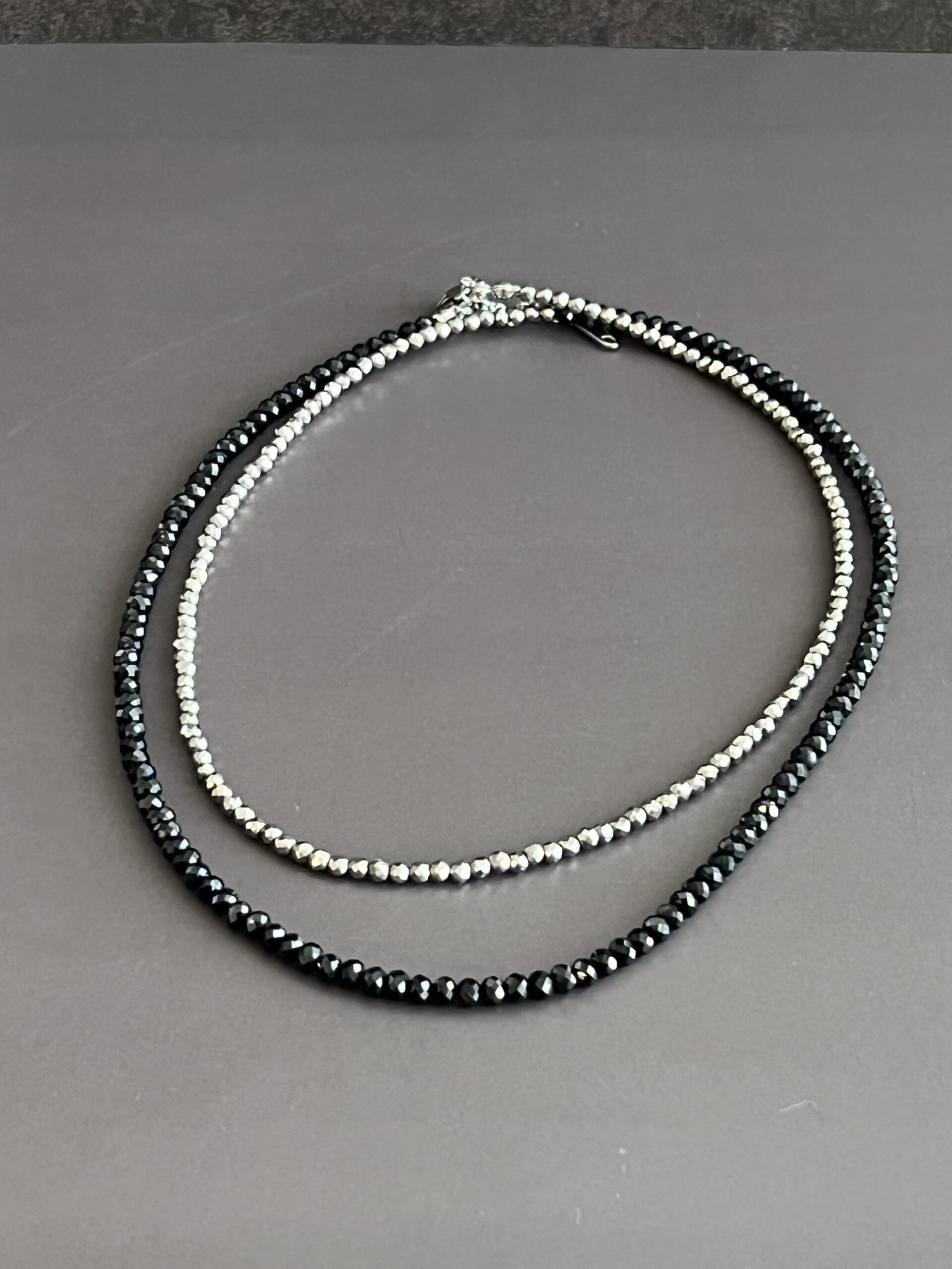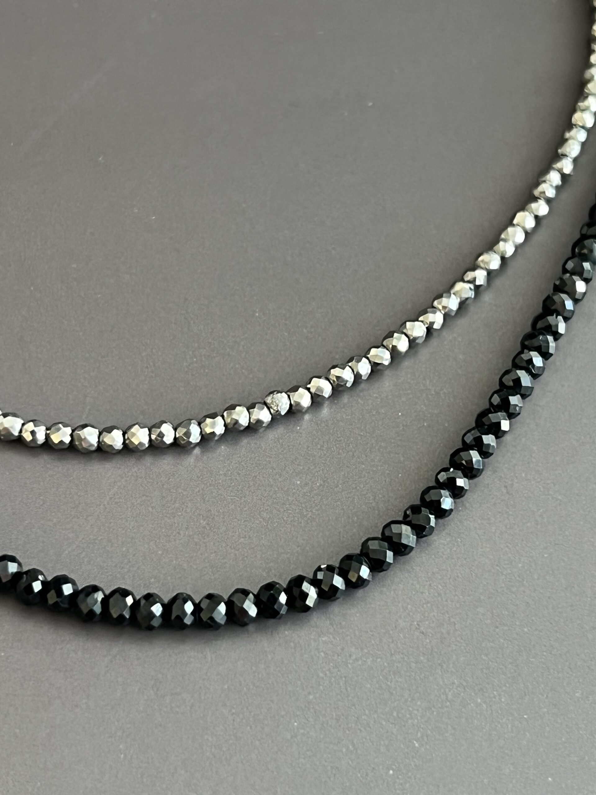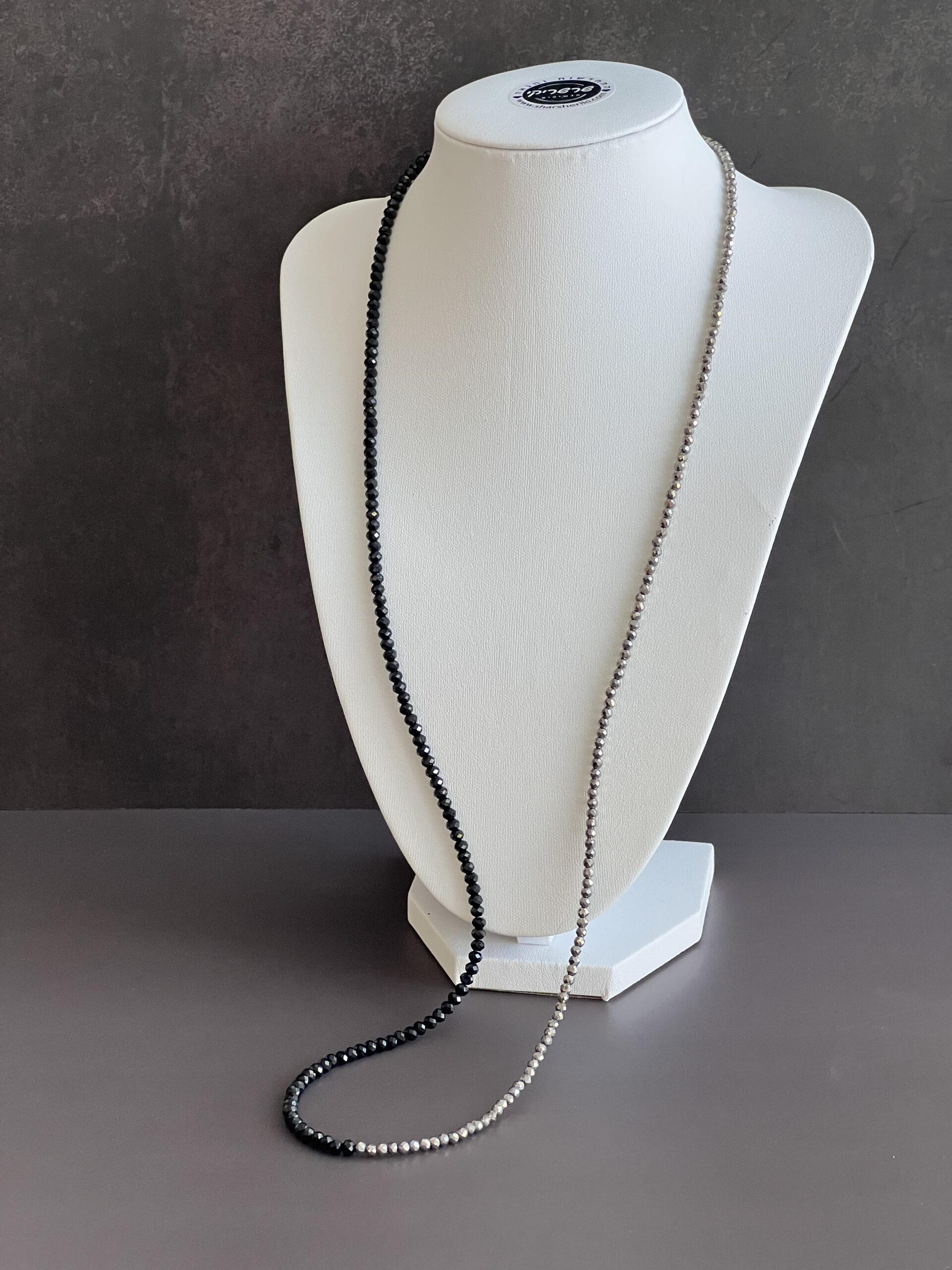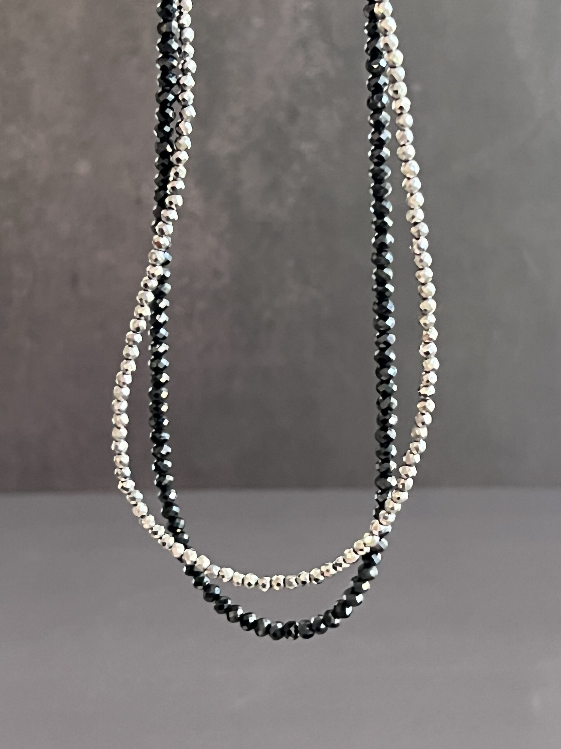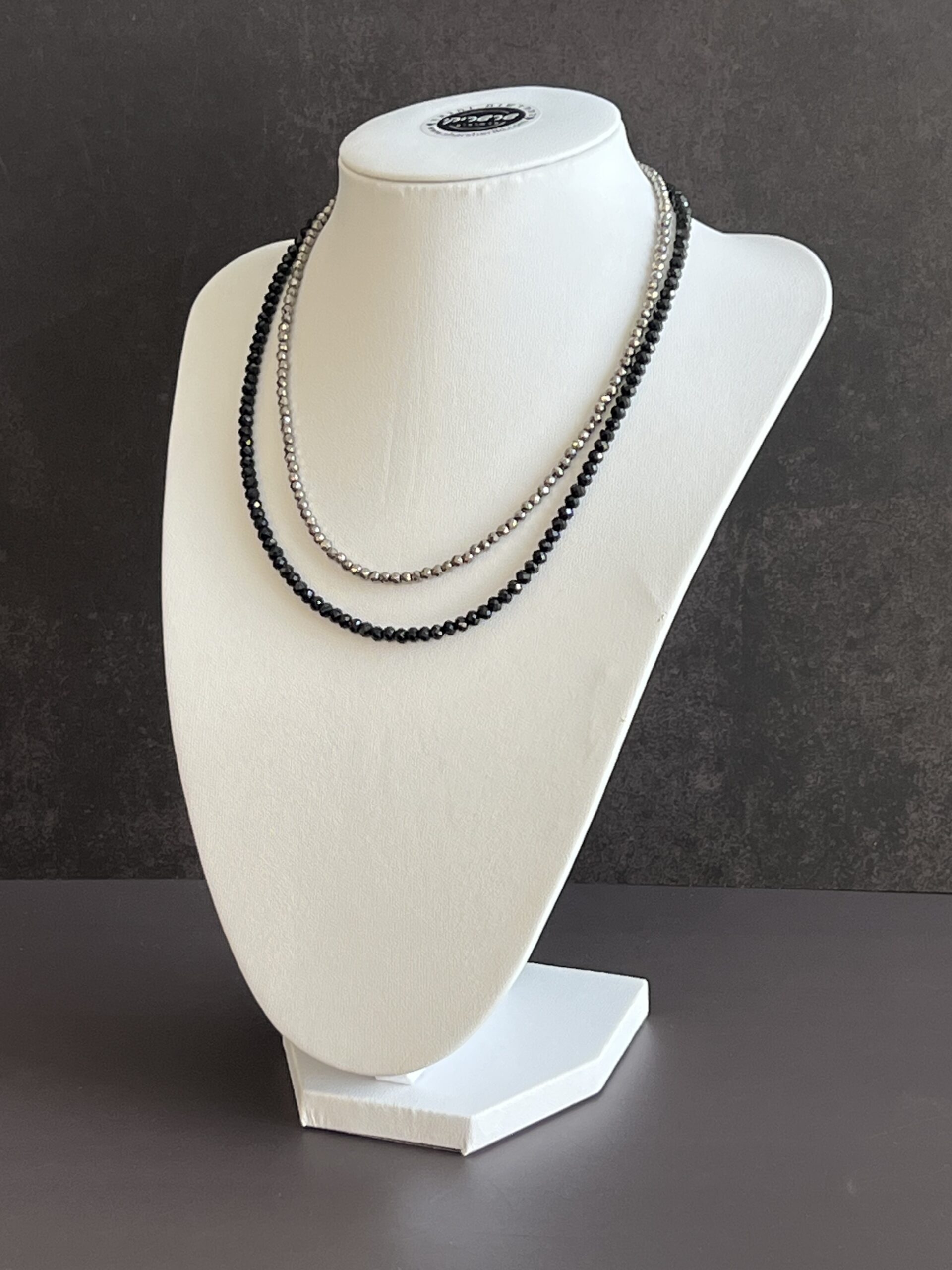 שרשרת שהיא שתיים באחת עשויה חרוזי אוניקס שחורים וחרוזי קריסטל כסופים שניתן לענוד כשרשרת ארוכה או ללפף לשתי שכבות כשרשרת צמודה ולקבל מראה שכבות ללא מאמץ .