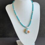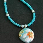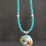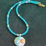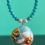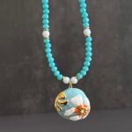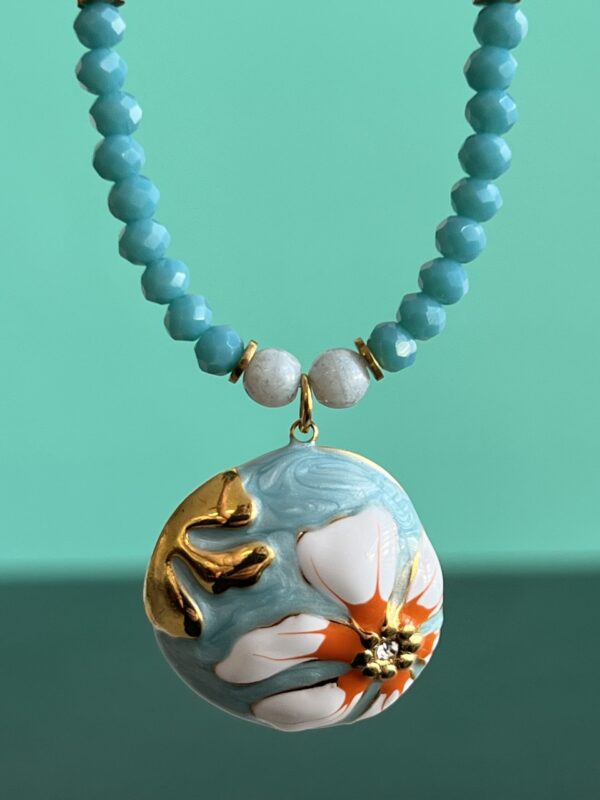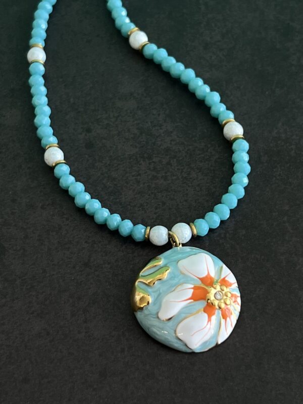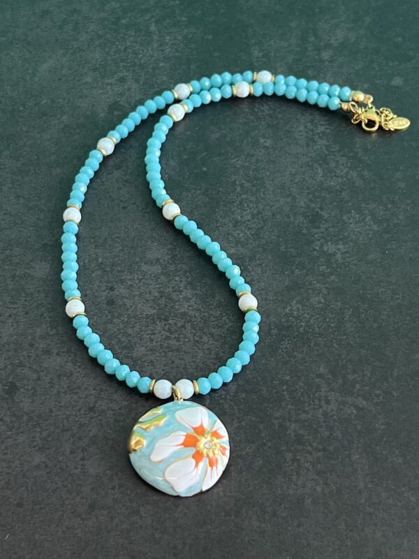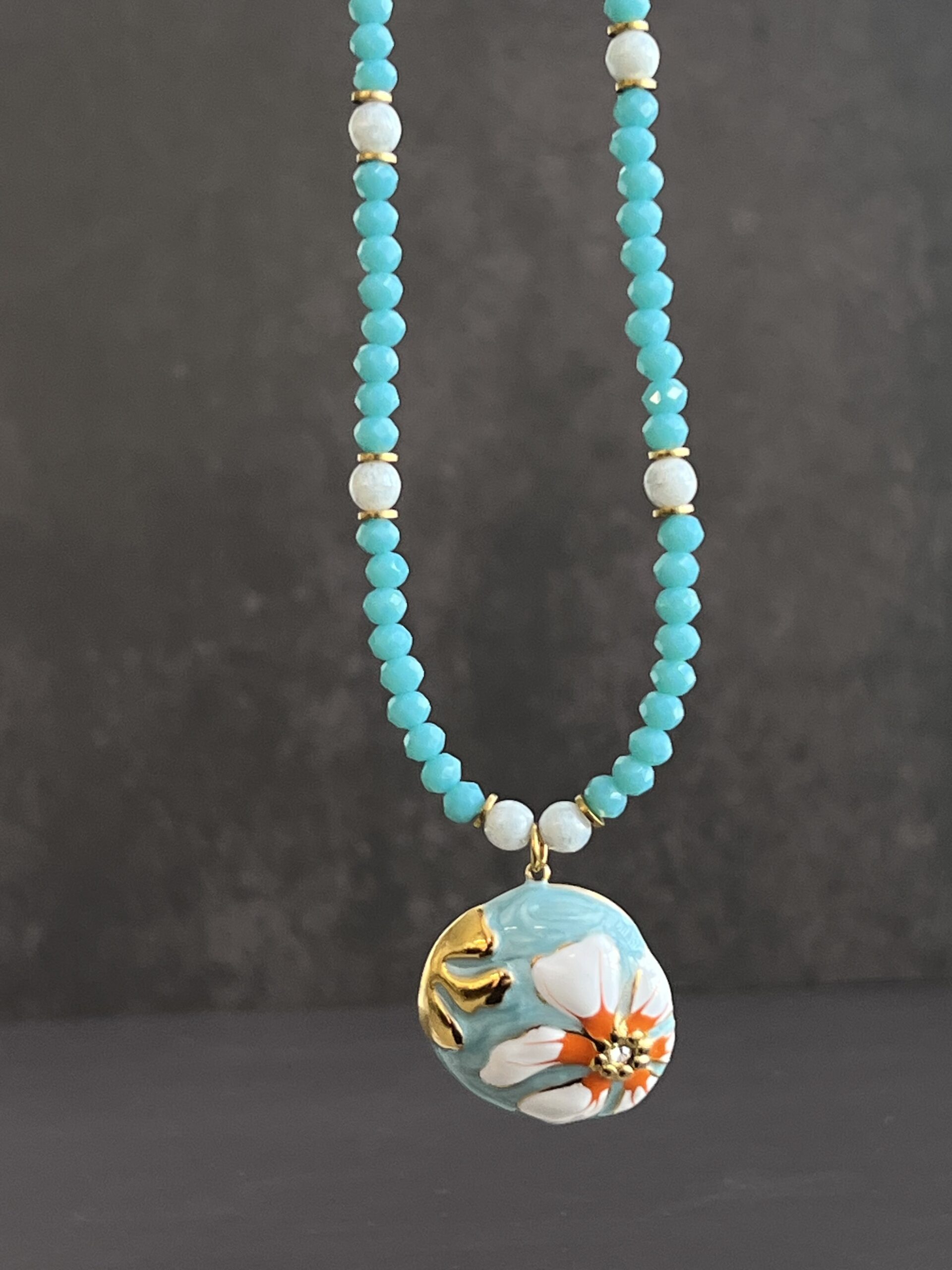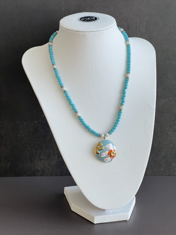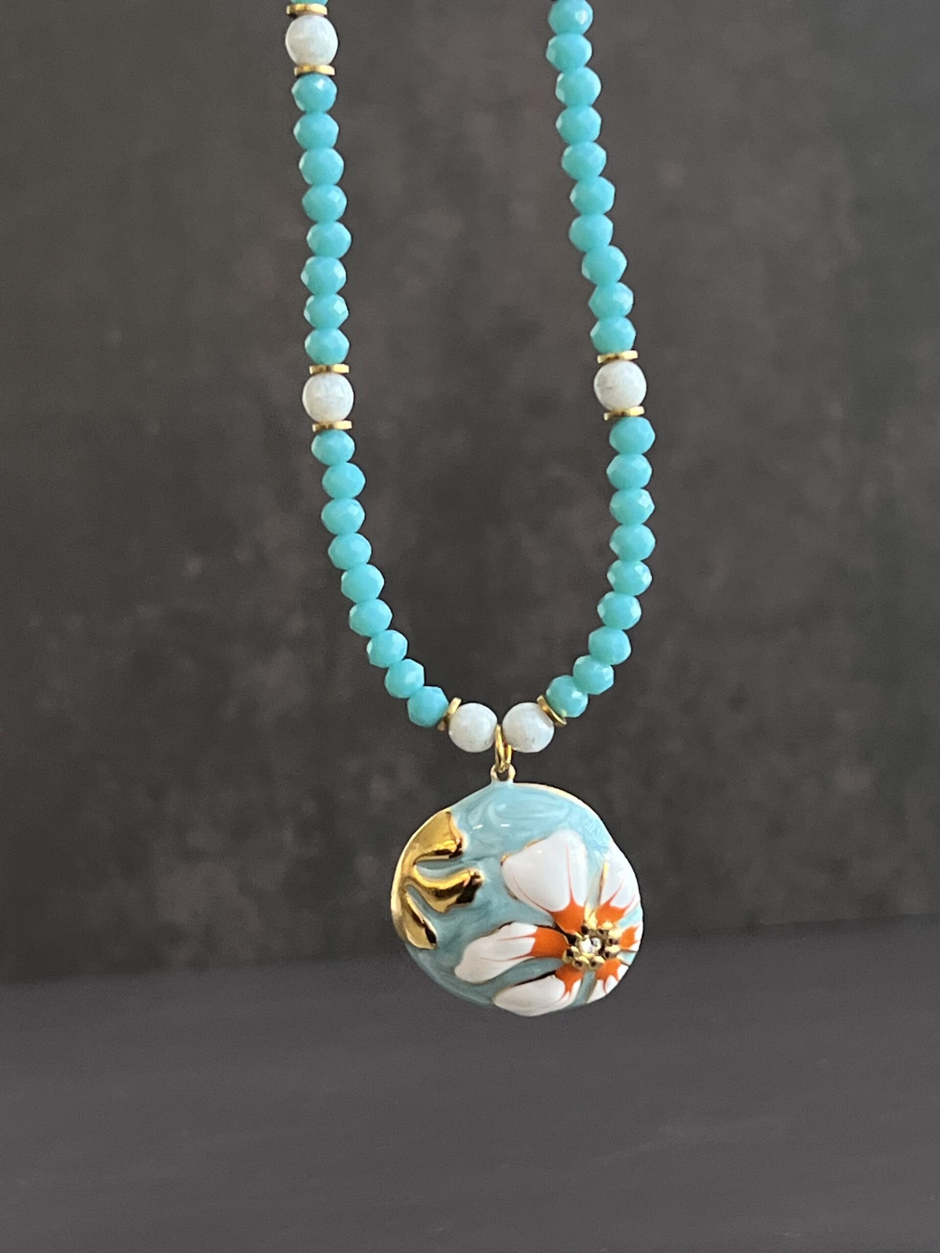שרשרת עשויה חרוזי קריסטל בגוון טורקיז בשילוב חרוזי זכוכית תכולים עם תליון אמייל מעוטר בפרח .