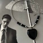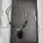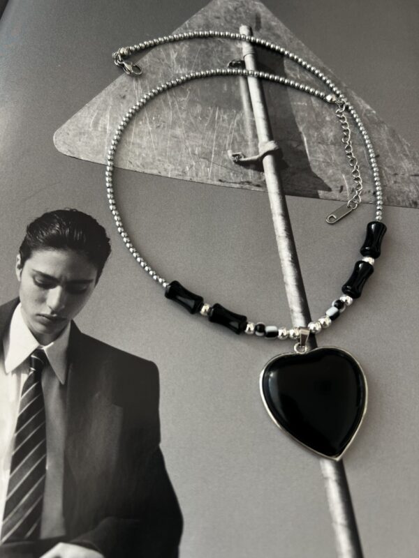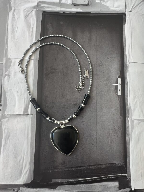 שרשרת עשויה חרוזי המטייט וזכוכית עם תליון לב אבן אגת שחורה . מלאת נוכחות ושיק.