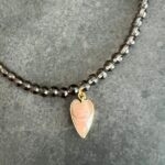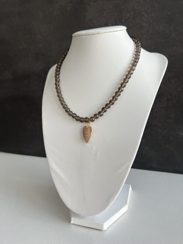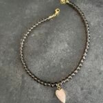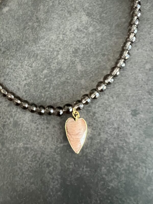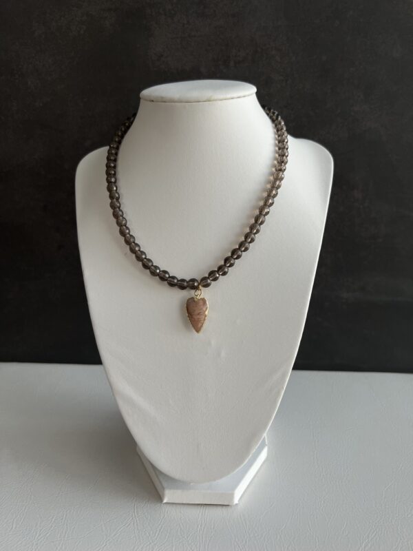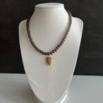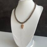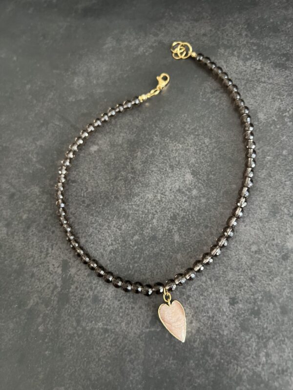 שרשרת חרוזי קוורץ בגוון חום חצי שקוף ולב קוורץ בגוון חום בהיר בג׳ .